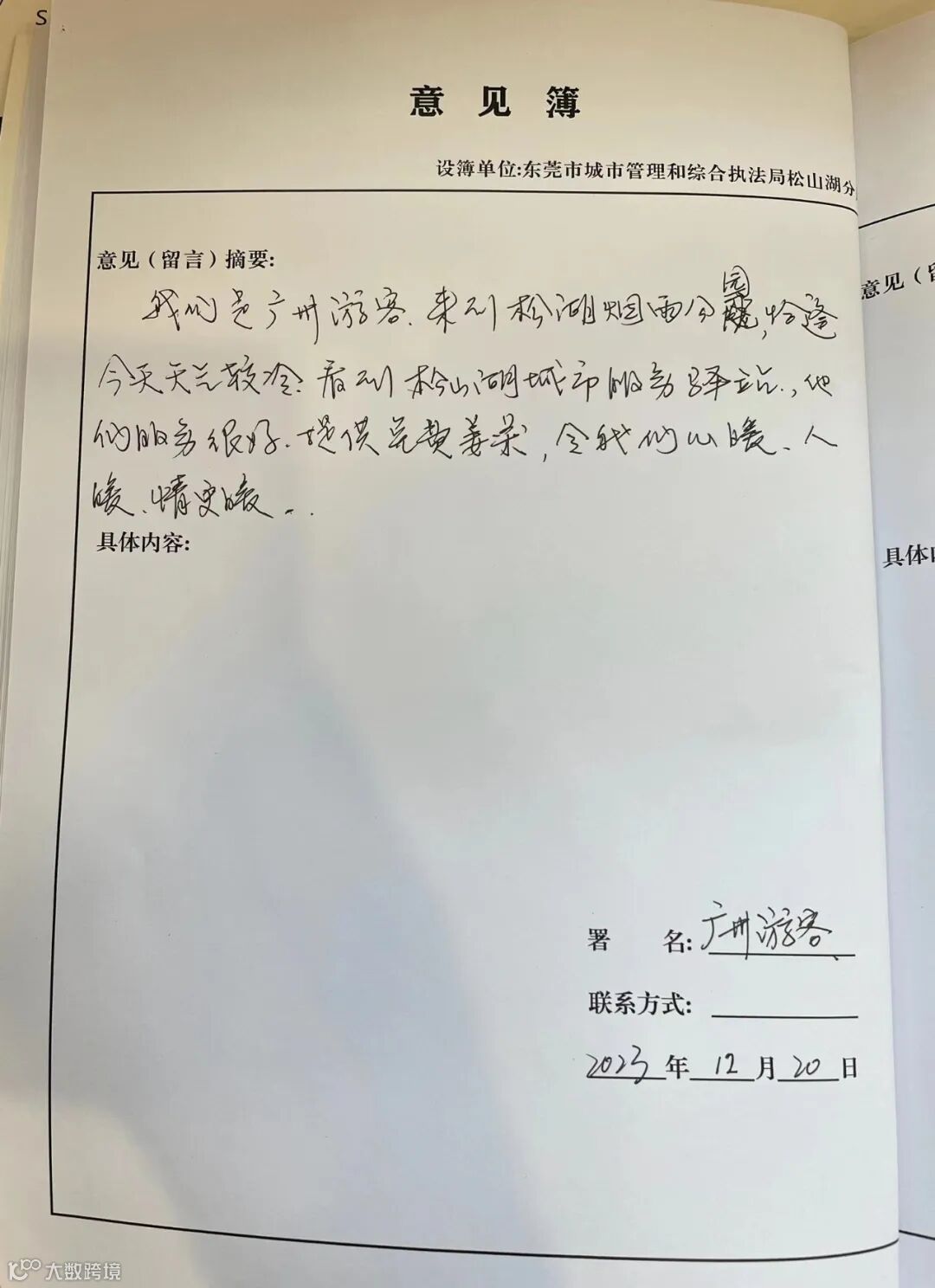 这份东莞温暖,也传递到广大游客心中。“松湖烟雨很美!寒风呼呼,没想到还能在这里喝上一杯热腾腾的姜茶,喝完身体暖和不少,我能感受到驿站工作人员的用心,东莞是一个有温度的城市!”一名广州游客感叹道。离开驿站前,她特意在驿站意见簿留言感谢。“松山湖城市服务驿站他们的服务很好,提供免费姜茶,令我们心暖、人暖、情更暖!”