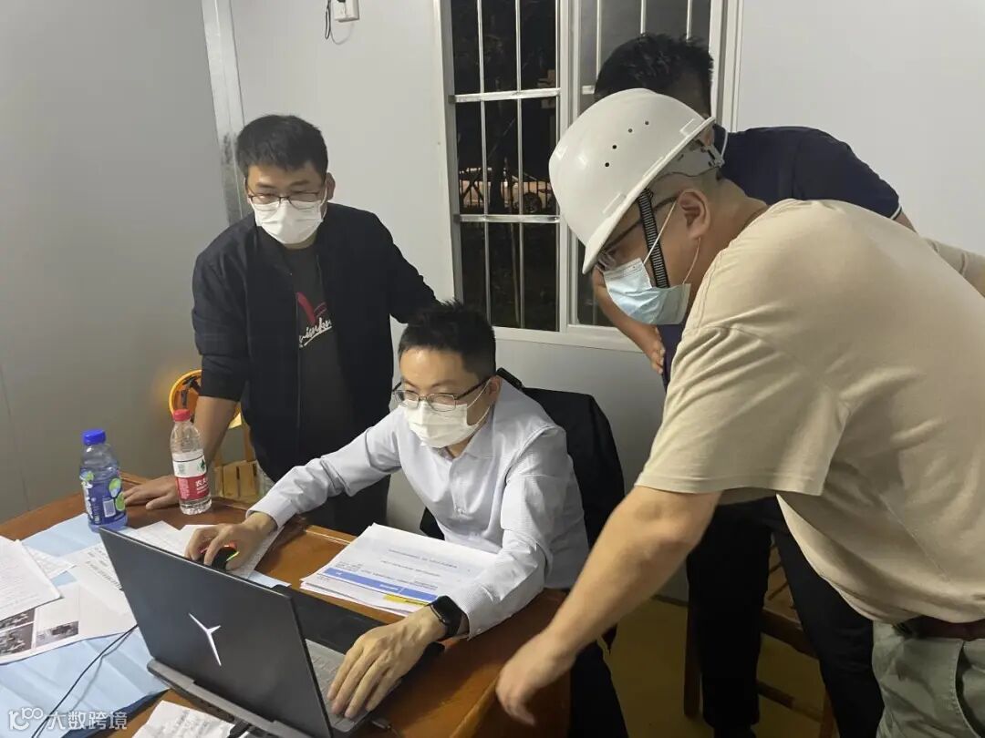 廖俊晟(左二)牵头在项目板房研究施工进度和图纸。
