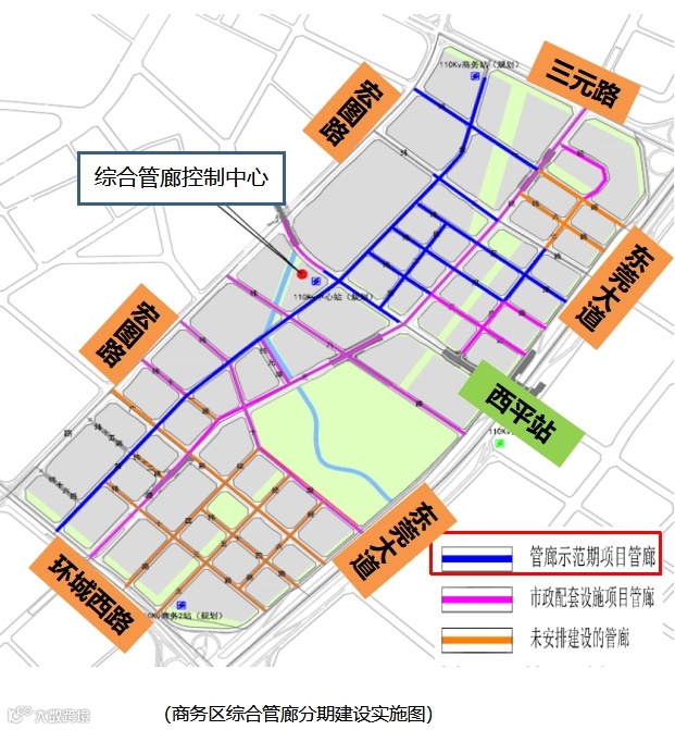 作为东莞市地下综合管廊试点项目,示范段管廊建设过程中面临跨跃广惠城际铁路、下穿新基河等难题,商务区公司通过政策先行、统筹协调、建管并重等举措,攻坚克难,按期完成廊体建设验收。