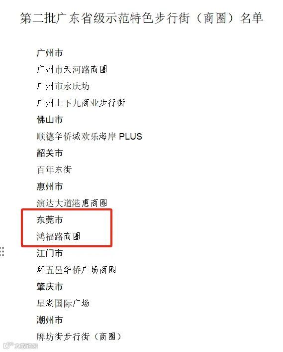 2021年11月,广东省商务厅公布广东省级示范特色步行街(商圈)名单,东莞鸿福路商圈成功入选第二批广东省级示范特色步行街(商圈)名单。一同上榜的,还有广州市天河路商圈、永庆坊、上下九商业步行街等知名商圈。