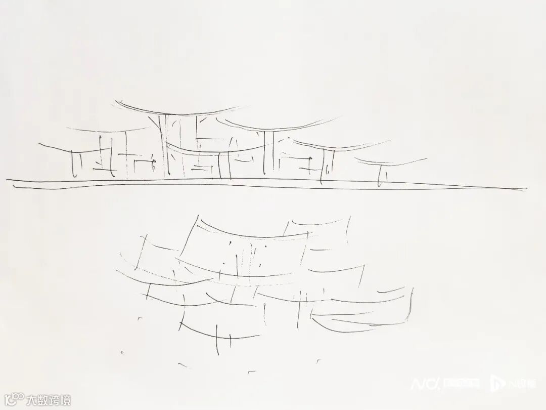 孟院士在一开始,便用手稿构建了一座由轻盈屋盖、立体街区为元素的半开放式花园建筑。