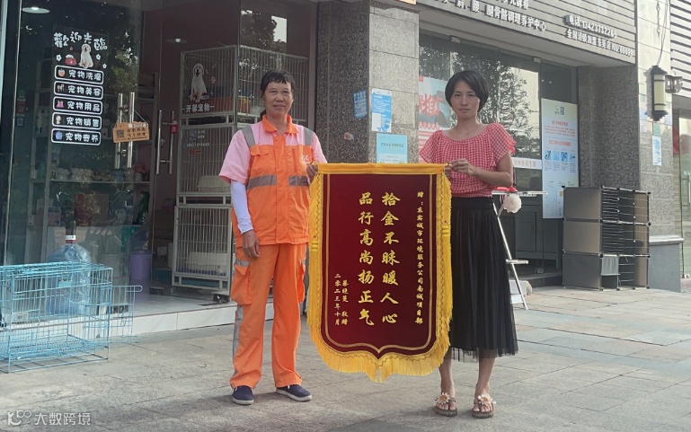 11月6日,市民蔡女士向东实城服公司南城项目送来一面印着“拾金不昧暖人心,品行高尚扬正气”的锦旗,对项目环卫工人王桂菊的拾金不昧、助人为乐之举表示感谢。