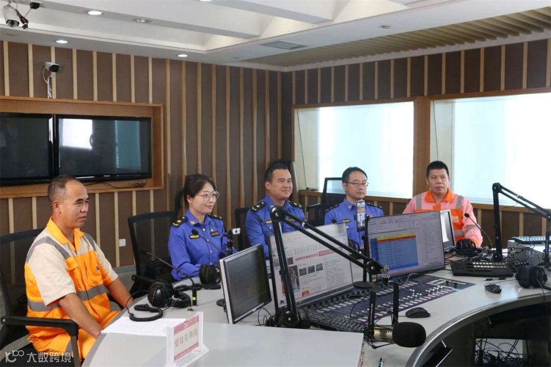 10月24日上午12:30,东莞市城市管理和综合执法局副局长叶志锋带队,市容环卫科科长杨婧婧、莞城城管分局副主任尹柏枝、东实城服公司环卫项目主管王应球、家宝公司环卫工人代表雷沅持,作客东莞广播电视台FM100.8“城市的声音”——致敬东莞城市美容师特别节目。在广东省第30个环卫工人节来临之际,为市民们提供了一个了解东莞环卫工作的渠道,现场介绍了东莞环卫工人真实作业情况、环卫作业机械化智能化的新进展等,以及分享了环卫工人与城市共同成长、双向奔赴的故事。节目现场还与市民在线上直播互动,回答了有关环卫工人及工作的疑问。