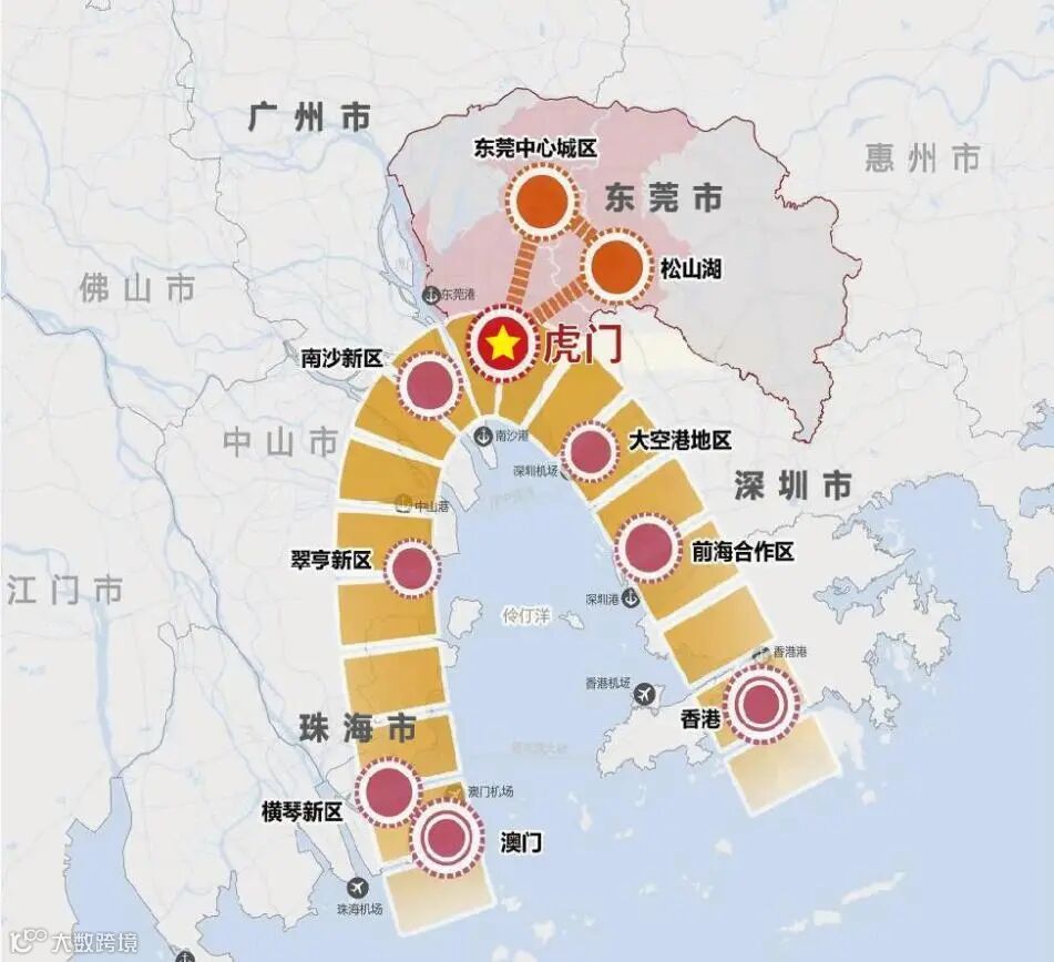虎门在广州南沙自贸区和深圳前海蛇口自贸区的环抱之中,与广州南沙自贸区经虎门大桥一桥相连,是东莞唯一集高速铁路、城际轨道、地铁、高速公路与粤港澳航线于一体的区域性交通枢纽,可快速接驳湾区核心城市,融入粤港澳大湾区“一小时生活圈”。