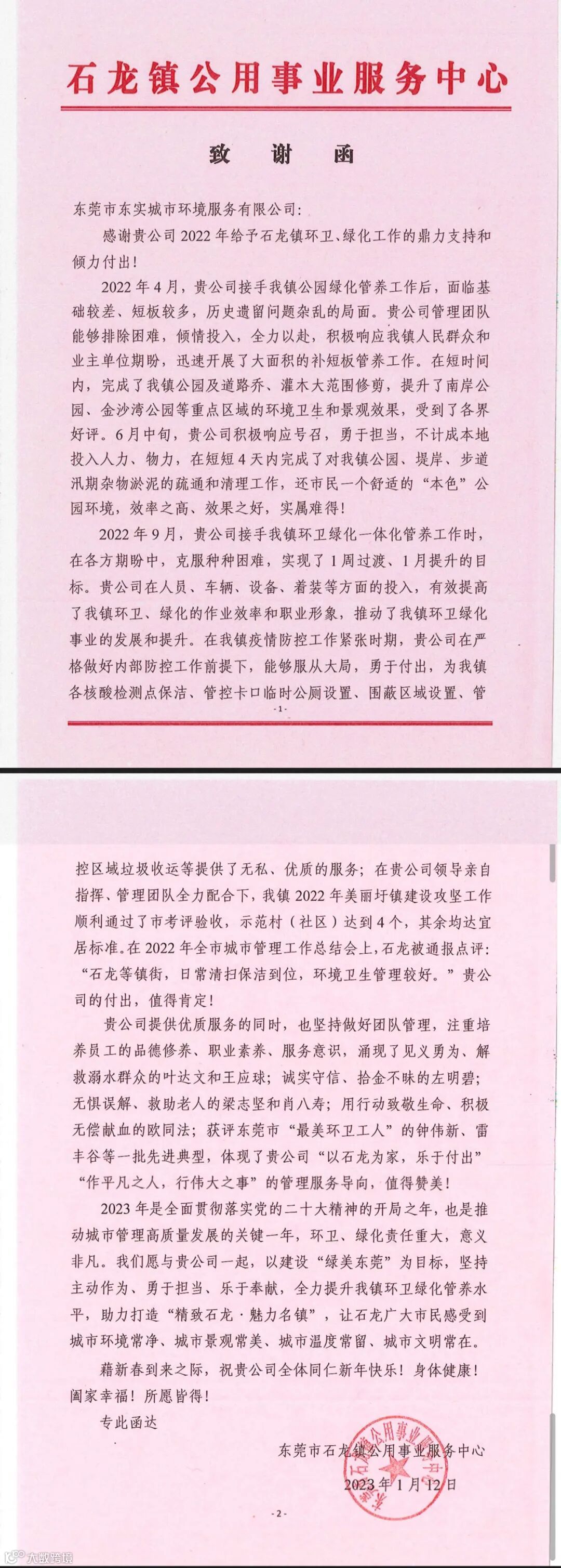自2022年以来,东实环境在东莞各个镇街广泛推广“城市大管家”模式,先后与石龙、桥头、麻涌、道滘、南城、清溪、寮步、松山湖等8个镇街达成合作,实现了“从0到8”的快速拓展。同时,东实环境还承接了东江河和运河市区段水上保洁项目、国省县道公路保洁项目。通过“城市大管家”项目拓展,东实环境有力推动了城市环境全要素管理,获得市、镇(街道)等有关单位的充分肯定。