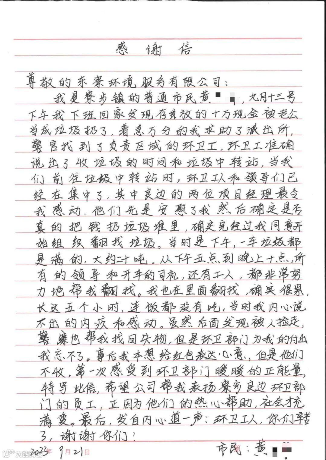 据悉,黄女士的10万元被人捡到了,最终由公安部门通过监控寻回,但黄女士对东寮公司的协助十分感激,于是带着锦旗和手写信来到东寮公司,将其送给所有工作人员,“感受到暖暖的正能量,正因为他们的热心帮助,社会才充满爱。”