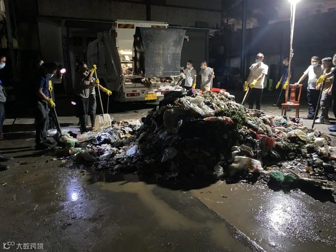 戴上口罩、手套,穿着雨鞋,拿着铁锹,东寮公司的工作人员在酷暑高温下对25吨垃圾一袋又一袋地仔细翻找,从下午五点一直持续到晚上十点。“我当时就抱着孩子在现场,他们真的很辛苦帮我们找了一晚上,都是看在心里的。”黄女士回想起来,觉得十分感激。