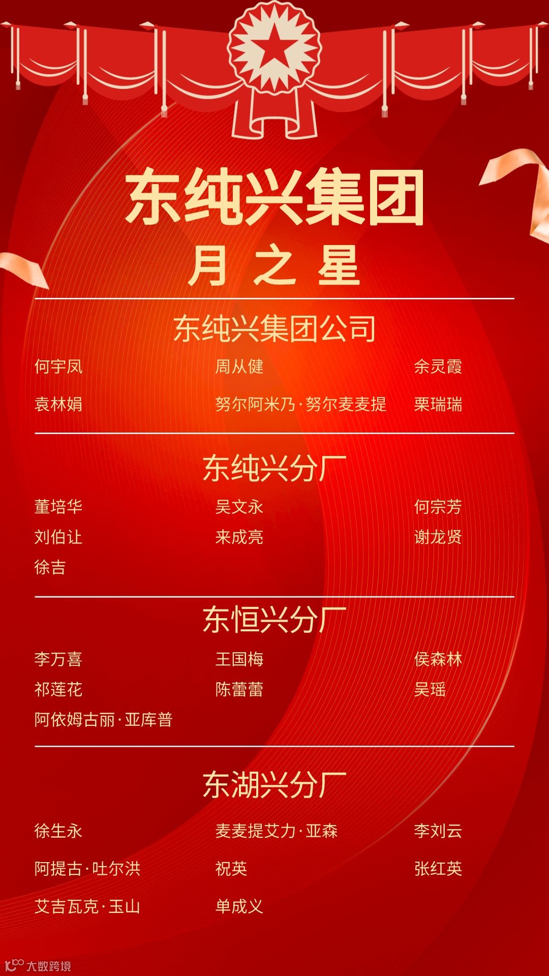 为树立优秀典范,展现员工风采,促进学习交流,弘扬传承企业文化,提供正向激励,东纯兴集团经过综合考评,授予28名员工九月份“月之星”荣誉称号,以资鼓励。