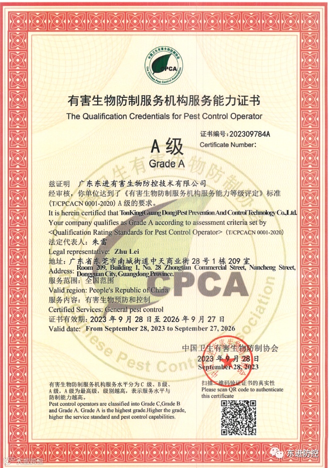 近日,广东东进有害生物防控技术有限公司(以下简称“东进公司”)正式取得由中国卫生有害生物防制协会(CPCA)颁发的中国有害生物防制服务机构服务能力A级资质,成为东莞市唯一一家同时具备国家、省、市行业最高等级资质的企业。同时,东进公司也是目前全国唯一一家专业针对有害生物防控防治的国有性质企业。