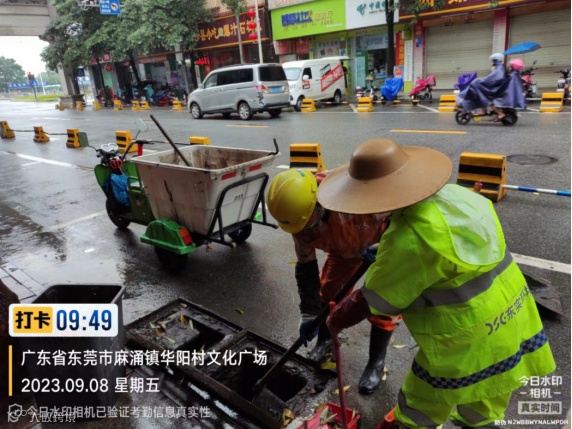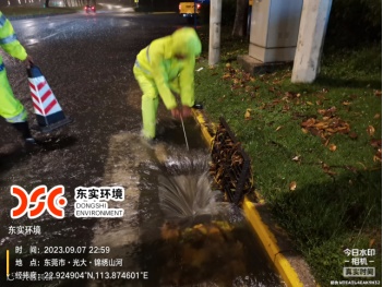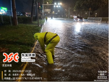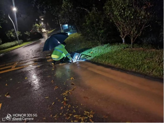 在暴雨降临的9月7日23时许,城服公司环卫工人仍然坚守一线,清淤疏通,全力保障道路安全畅通。