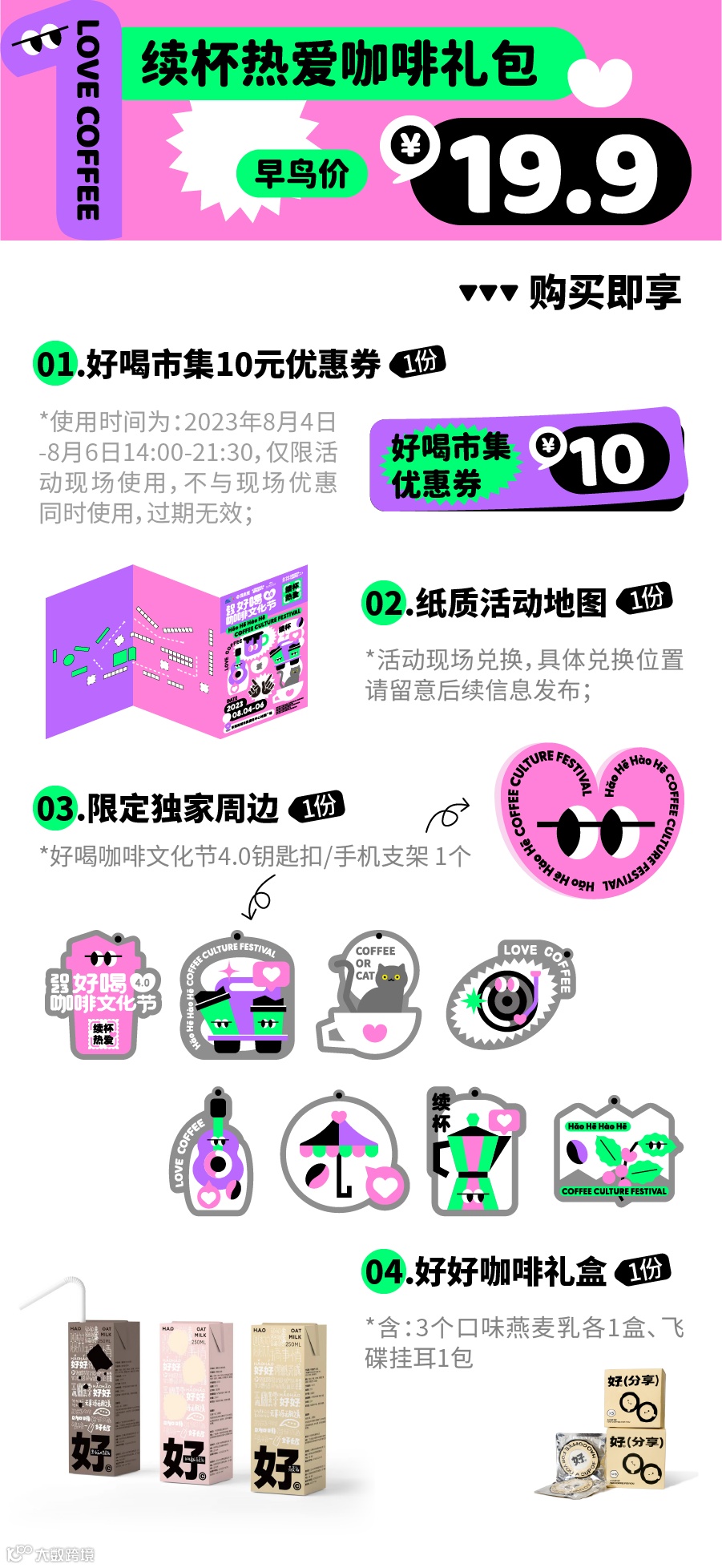 “好喝咖啡文化节4.0——续杯热爱”活动现场无需门票,欢迎所有热爱咖啡的你们前来参与。但是,为让大家在咖啡节中留下美好的回忆,我们为啡友们准备了2款「续杯热爱咖啡礼包」,礼包除了有好喝市集优惠券,还有独家周边和好好咖啡品牌产品伴手礼噢,绝对让你值回票价!