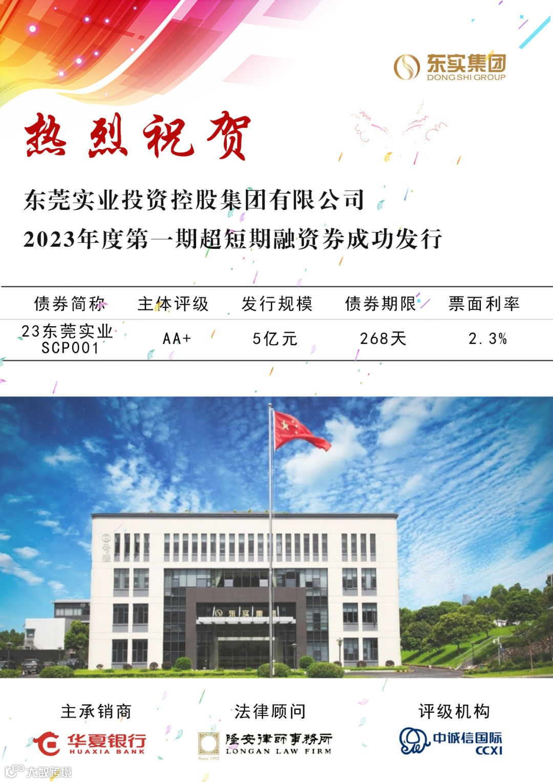 6月20日,东莞实业投资控股集团有限公司在银行间债券市场成功发行2023年度第一期超短期融资券。这是东实集团继成功发行20亿元中期票据后,又一次利用债券市场开展直接融资。本期超短期融资券发行规模5亿元,发行期限268天,票面利率2.3%,创2023年度以来广东省内同评级同期限利率新低。本次超短期融资券的成功发行,意味着东实集团开创了直接融资市场的“新起点”,进一步拓宽集团直接融资渠道,有助于集团优化债务结构、降低融资成本,为集团实现高质量发展提供有力支撑。