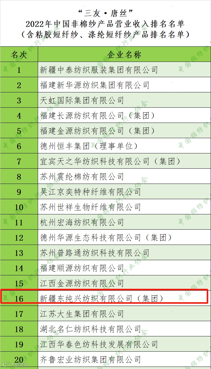 近期,中国棉纺织行业协会发布“三友·唐丝”2022年全国非棉纱产品营业收入排名名单,新疆东纯兴集团排名第十六,较2021年提升二个名次;2022年中国粘胶短纤纱产品营业收入排名第十一;2022年中国喷气涡流纺纱产品营业收入排名第六。