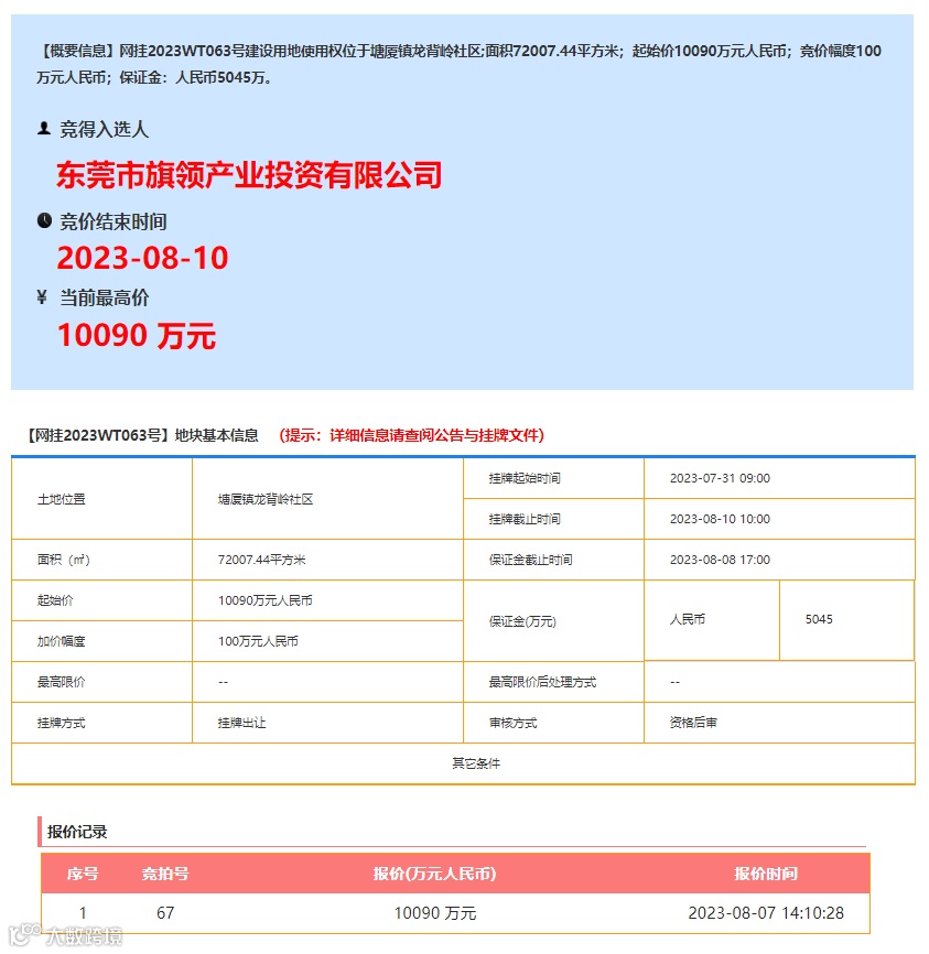 8月10日10:00,位于东莞市塘厦镇龙背岭社区地块(2023WT063号)最终竞拍结果出炉,东实集团下属公司东莞市旗领产业投资有限公司以底价10090万元成功竞得地块。该地块是东莞首宗挂牌出让的高品质、低成本优质产业空间用地。