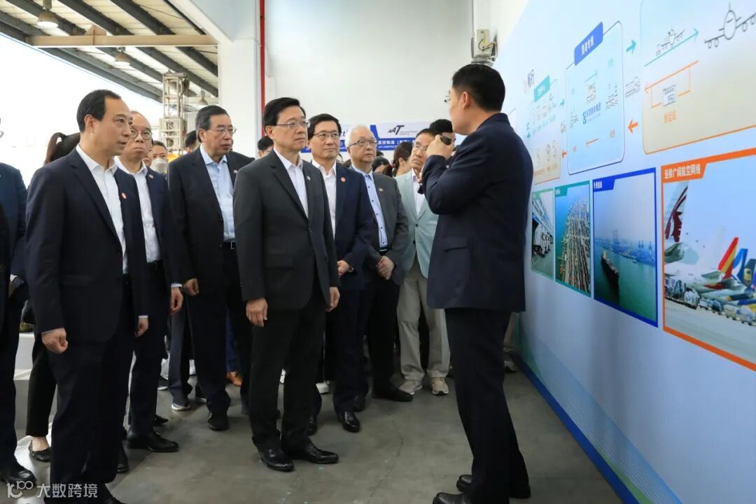 23日上午,访问团首先来到东莞——香港国际空港中心(下称“空港中心”),了解空港中心的运作模式及运作情况。据介绍,空港中心是全国首个直达机场空侧的海陆空联运项目,被广东省列入实施《粤港合作框架协议》重点工作。该项目也是莞港落实建设粤港澳大湾区战略、粤港澳合作的首创性项目。项目于今年4月18日正式运行,内地出口货物可在空港中心“一站式”办理海关通关手续、完成航空安全检查和打板,通过海运直达香港机场装机、发往全球。李家超表示,空港中心的运作模式,为大湾区货物提供更无缝、便捷的国际空运网络,相信能进一步发挥香港的空运中转枢纽功能。