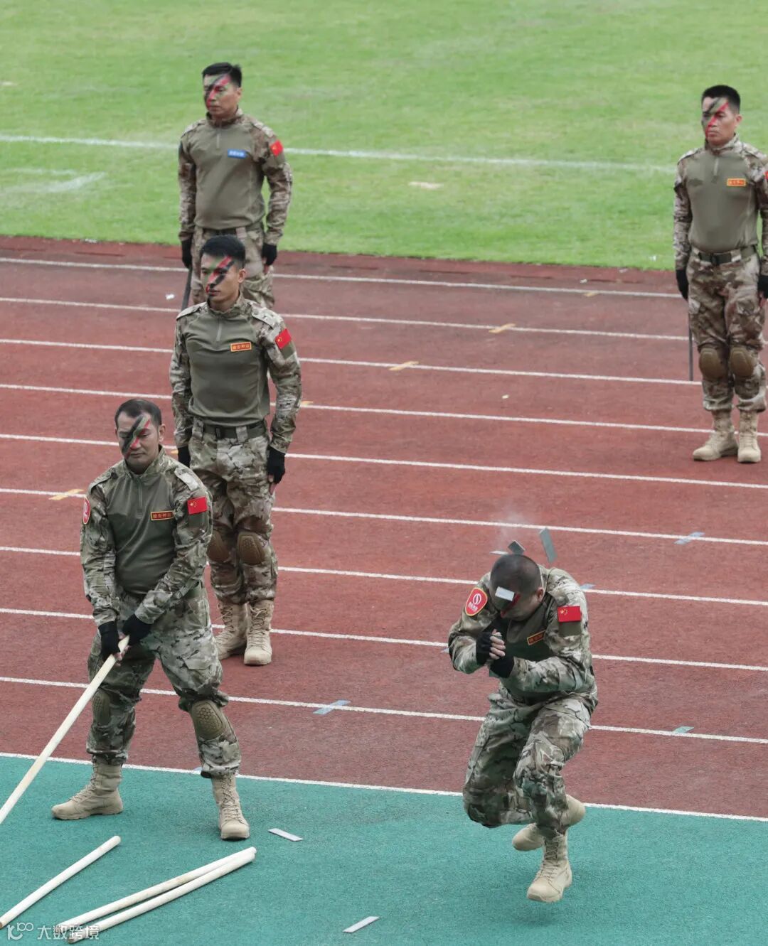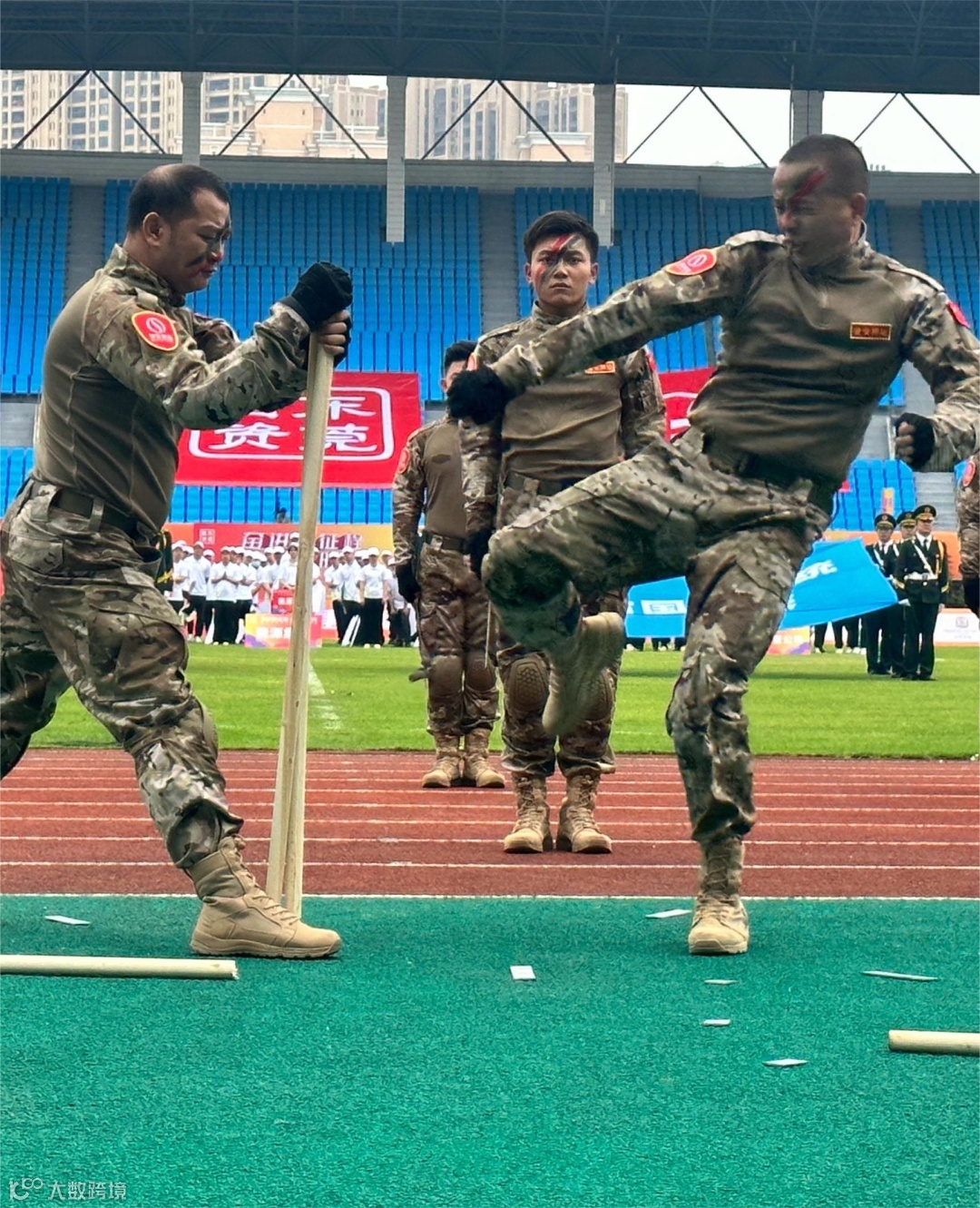 由东实集团骏安押运公司和水务集团退伍转业军人联合表演的《国资雄风》节目更将全场气氛燃至最高潮。不仅有擒拿格斗基础招式的展示,一拳,两拳,拳拳气势磅礴,三声,四声,声声振奋人心;更有“头开钢板”、“背开木棍”的“绝活”,“叮!”“嘭!”钢板、木棍应声而断,观众们连连称赞,无不拍手叫好。