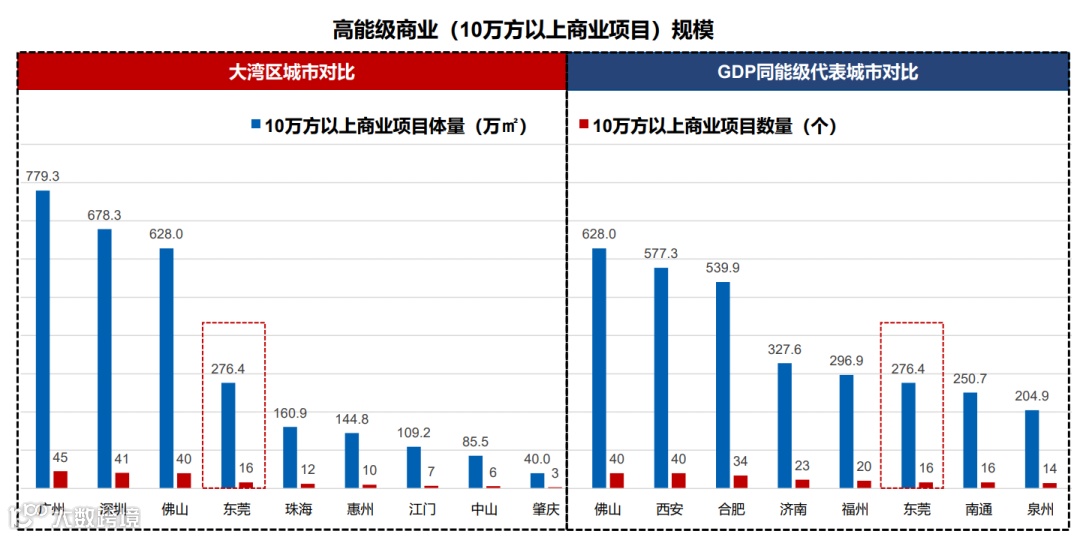 然而,尽管商业新增体量不小,但相比长沙、天津、南京、沈阳等新一线城市,头部品牌聚集效应不足,相比大湾区其他城市、GDP同能级城市,高能级商业体的体量和数量偏低,仍与旺盛的消费需求不成正比,亟待头部商业品牌、高端商业体的进驻。因高端商业体的匮乏,不少东莞人选择到香港、深圳、广州等城市购买中高档商品,造成中高端消费力外流。