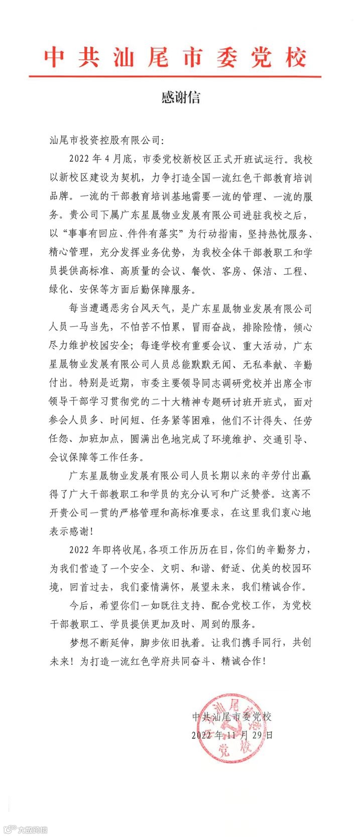 近日,东实集团东鸿公司与汕尾建城公司合资成立的星晟公司收到一封来自汕尾市委党校的《感谢信》。信中,汕尾市委党校对星晟公司“事事有回应、件件有落实、坚持热忱服务、精心管理”的工作态度及高品质服务给予充分认可和高度赞誉。