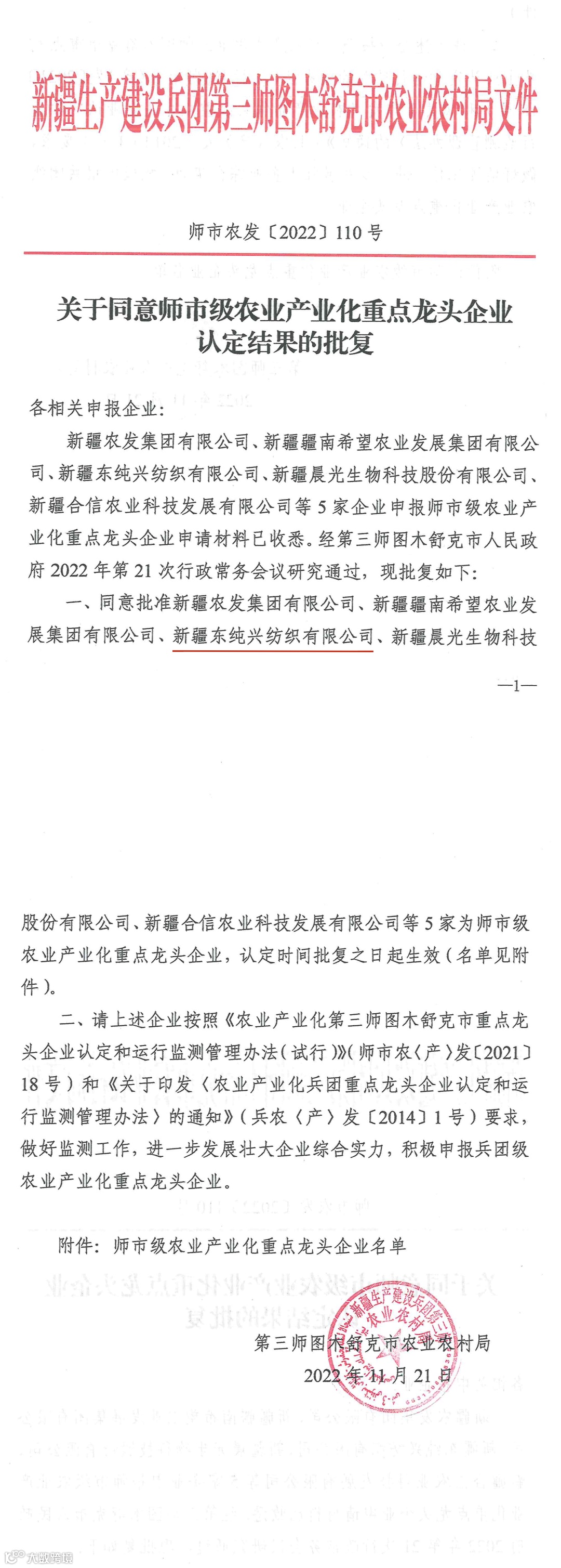 近日,新疆生产建设兵团第三师图木舒克市农业农村局发布文件,认定新疆东纯兴集团下属企业新疆东纯兴纺织有限公司为师市级农业产业化重点龙头企业。