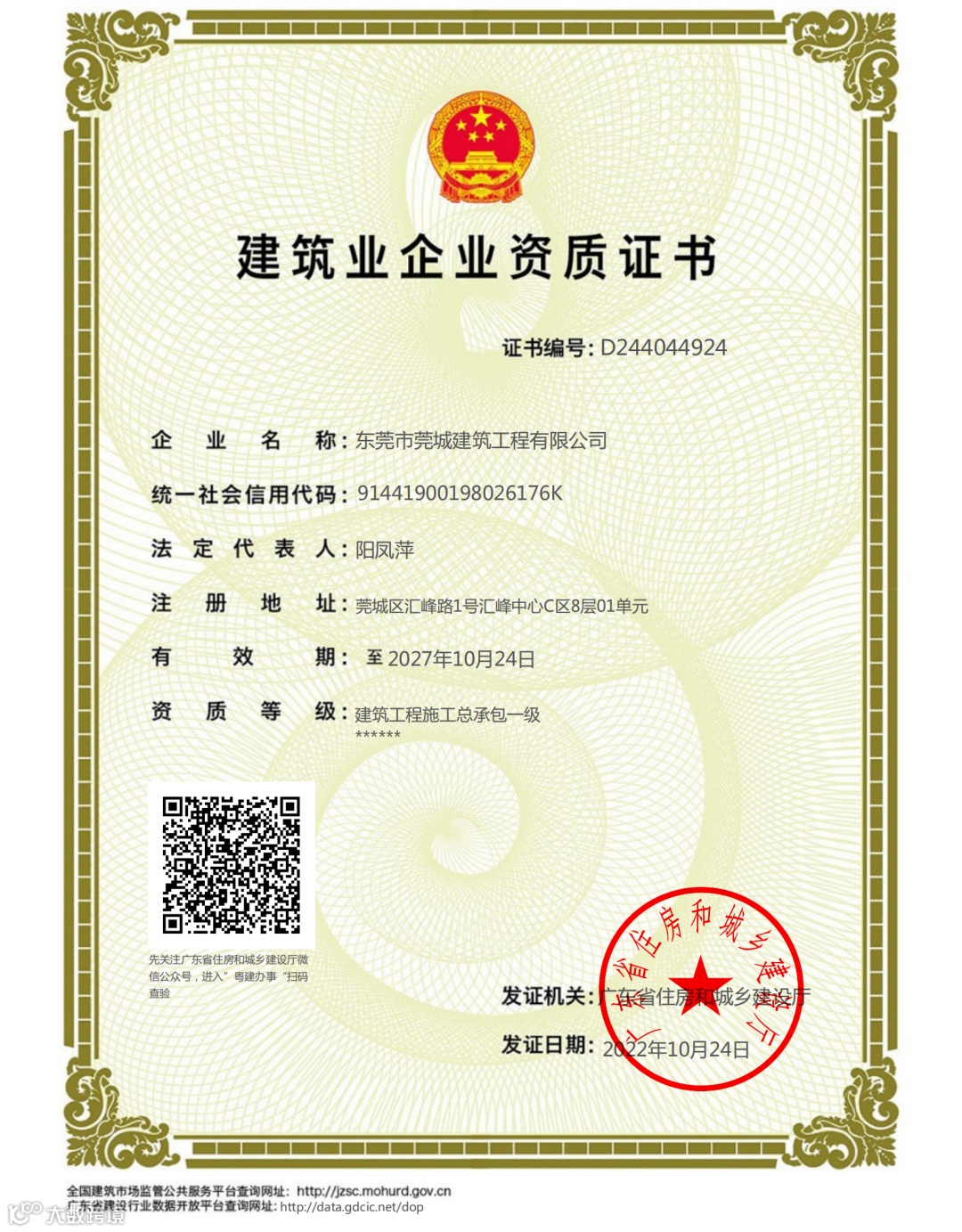 莞建公司成功取得总承包一级资质