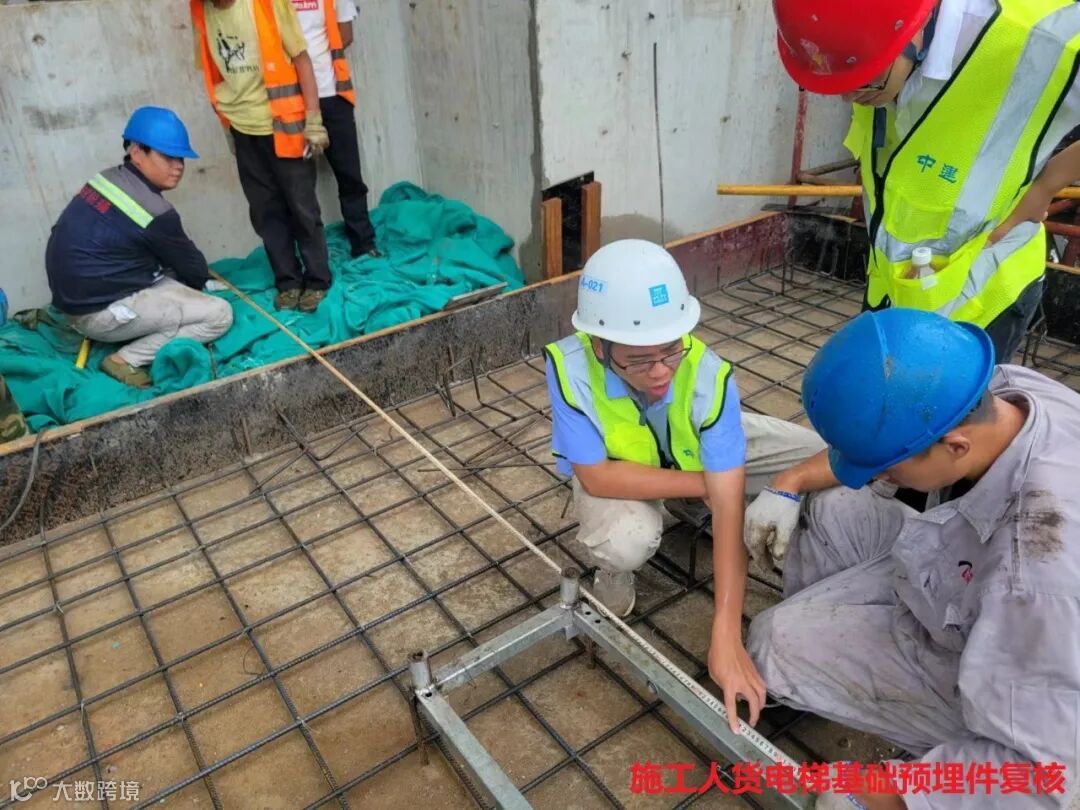 预埋件是预先安装或埋藏在隐蔽工程内的构件,在结构施工时提前安置,对外部搭接重要施工设备有重要作用。东实旗盛花园精准绘制施工人货梯定位图,在施工人货电梯基础预埋件安装时进行现场技术复核,根据结构实体定位调整,避免产生误差,在保证施工安全稳定性的同时,确保满足结构受力要求。