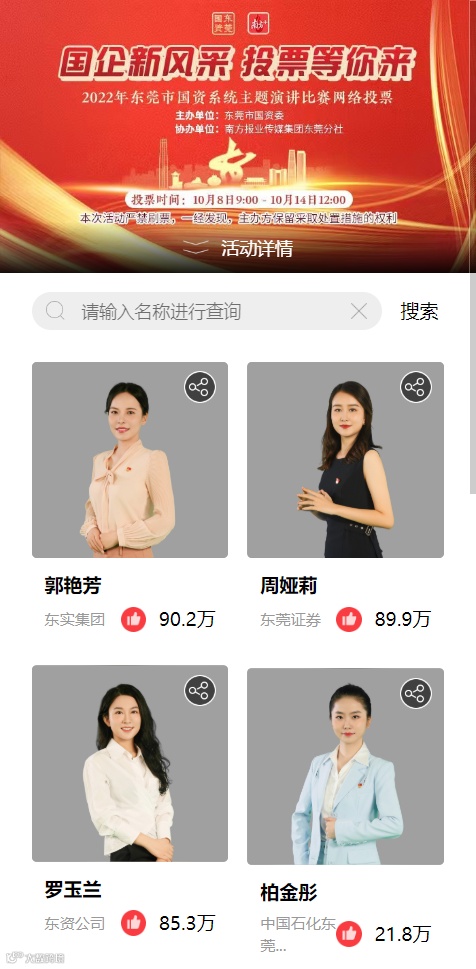 10月8日,演讲比赛网络投票通道正式开启,进入决赛的21名选手中,网络投票数最高者将荣获演讲比赛“最佳人气奖”。截至10月14日投票结束,东实集团郭艳芳共获得90.2万票,位列第一,3名东实集团代表选手总票数共超96万,成为名副其实的“人气王”。