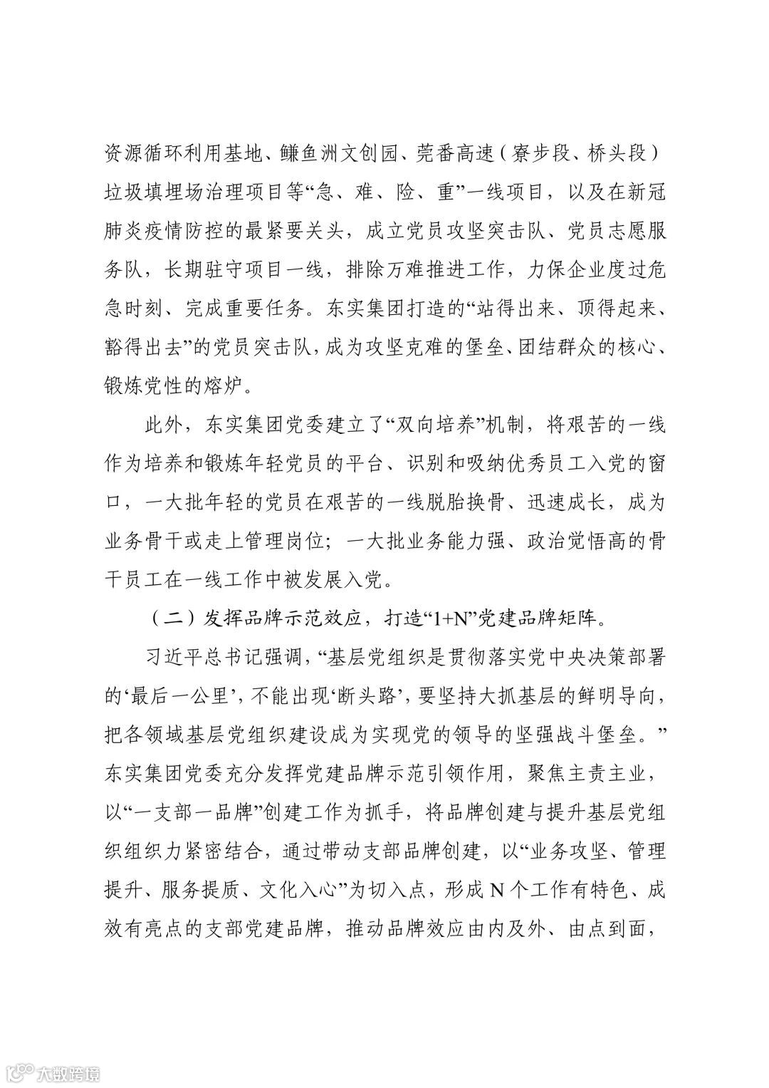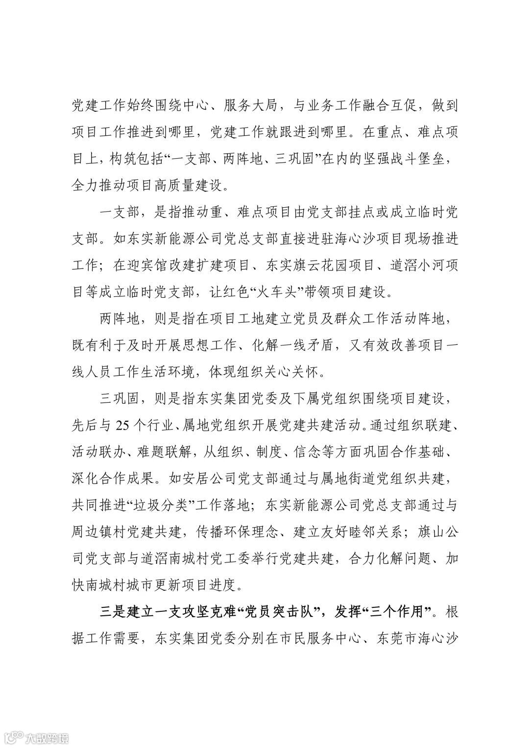 在落实层面,东实集团党委大力开展“1个项目+1个战斗堡垒”工程,形成“一支部、两阵地、三巩固”工作模式,通过项目党支部的攻坚引领,高质量推动完成各项工作任务。特别是在市民服务中心改造、莞番高速(寮步段、桥头段)垃圾填埋场治理以及新冠肺炎疫情防控等“急、难、险、重”一线现场,东实集团党委分别成立了“站得出来、顶得起来、豁得出去”的党员攻坚突击队、党员志愿服务队,长期驻守项目一线,力保企业度过危急时刻、完成重要任务。