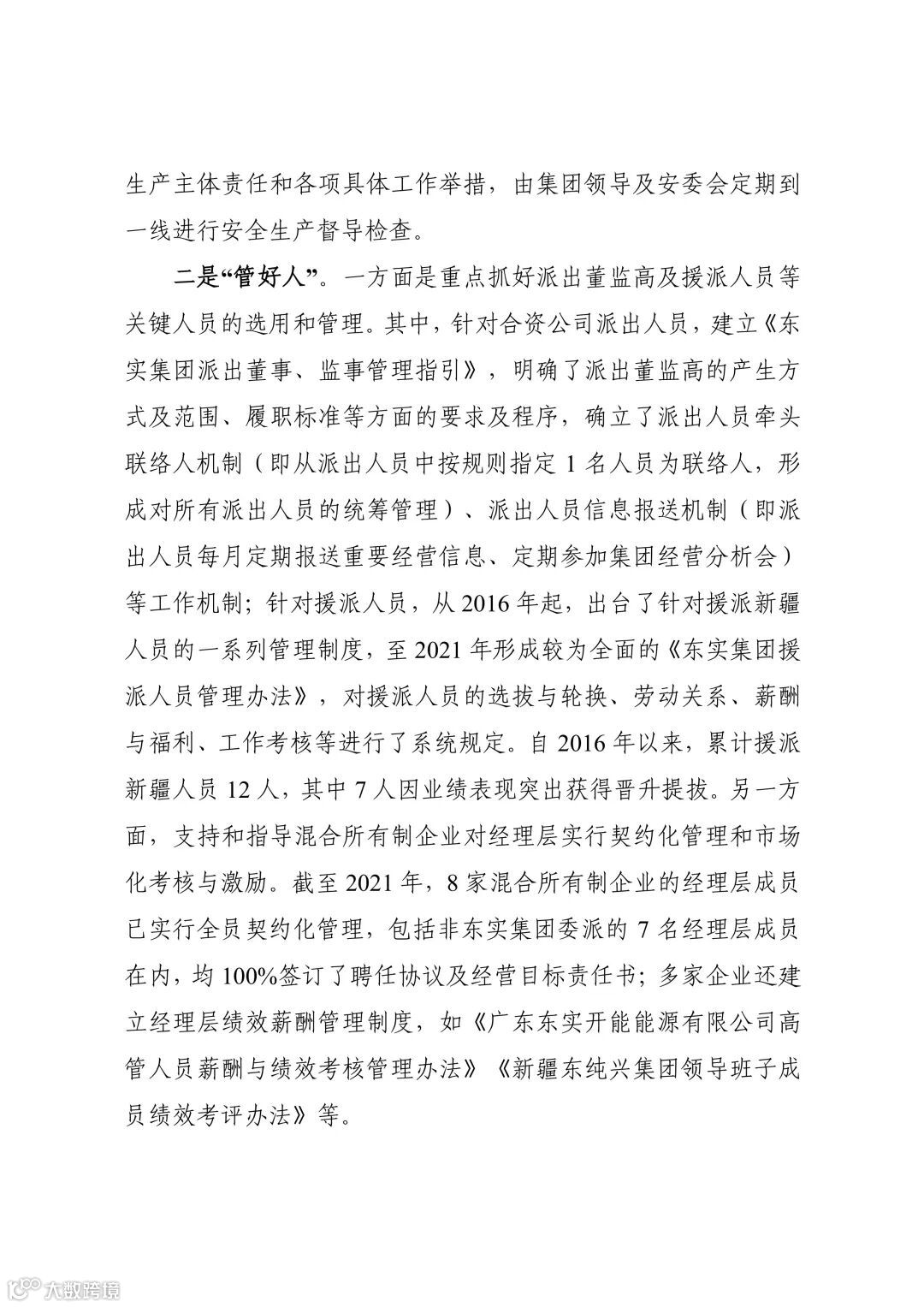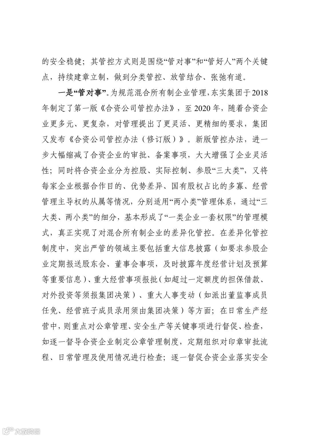 其中:“宽选”,就是以“海纳百川、为我所用”的胸襟广泛整合吸纳优势合作资源,为企业及时弥补关键短板、抓住战略机遇、实现快速发展。“慎引”,即坚持“周密论证、审慎决策”,通过组织跨部门、多专业的工作小组,高效精准地开展投前尽职调查。同时,分门别类建立谈判指导清单,确保我方合作权益得到有效主张。在决策阶段,更是建立了多层审议决策机制,确保混改决策科学审慎、合法合规。“善管”,针对下属企业,东实集团建立了“三大类、两小类”的企业管理体系,按照“一类企业一套权限”的管理模式,进一步缩减了合资企业的审批、备案事项,有效激活了混合所有制企业的市场化优势。“强评”,建立常态化的投后评价机制和完善的整改工作机制,通过对项目实施过程、结果及其影响进行系统调查和全面回顾,及时发现问题,制定整改方案,以此提高项目的运营水平和经济效益。