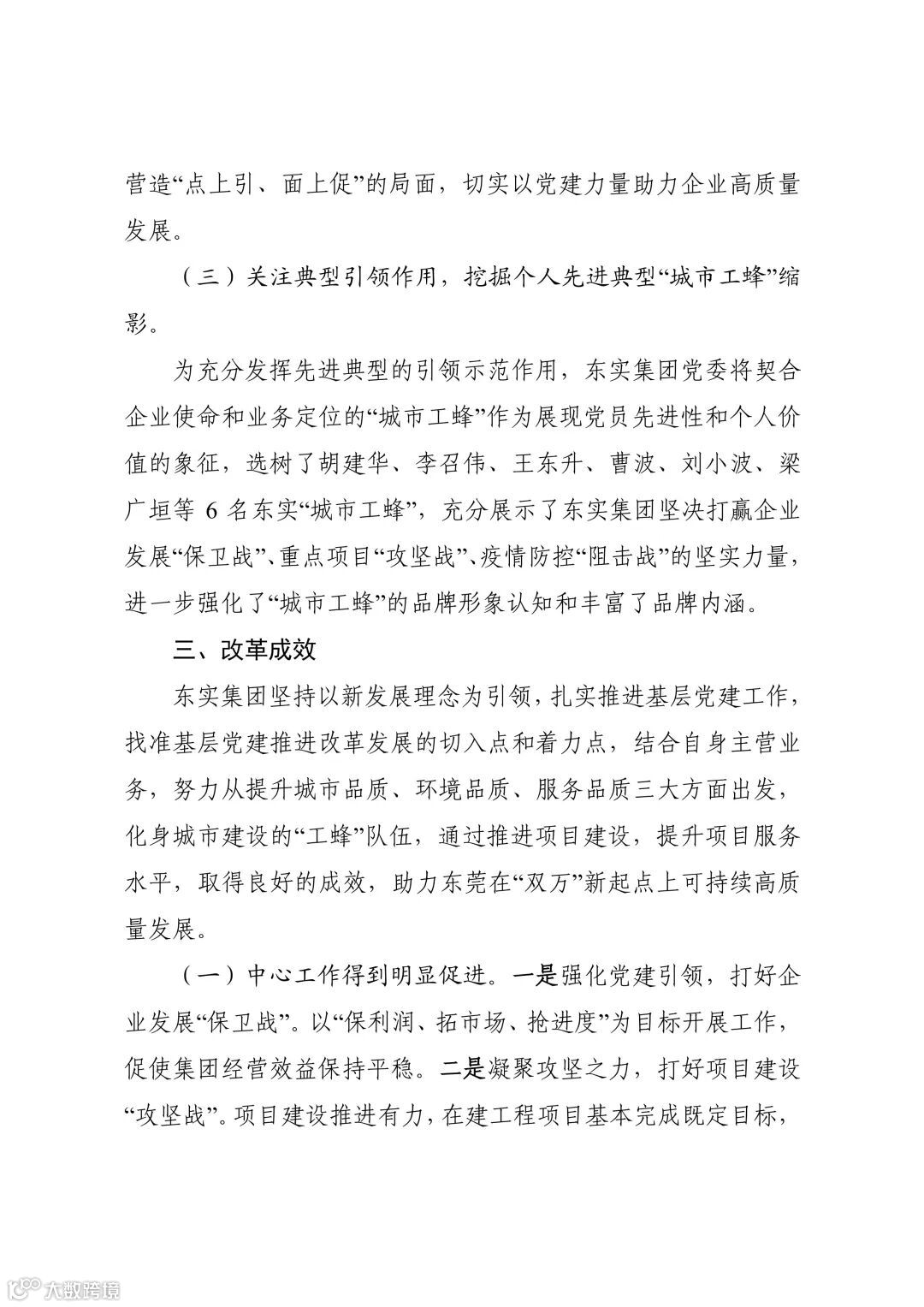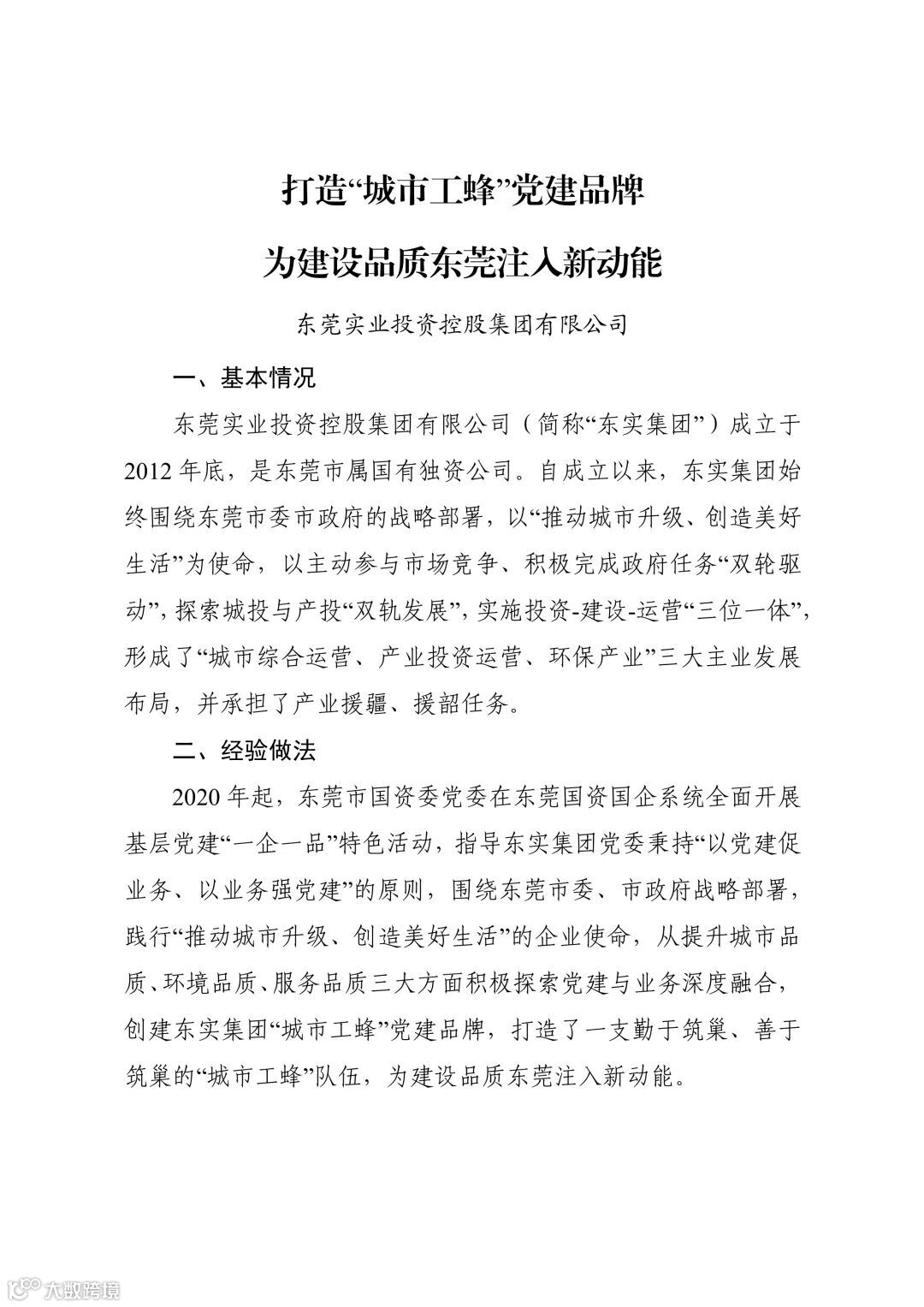 近日,在广东省国资委组织编写发布的《广东省国企改革三年行动典型案例汇编》中,东实集团《打造“城市工蜂”党建品牌 为建设品质东莞注入新动能》《以“混”促“改” 助力国企高质量发展》两个案例成功入选。