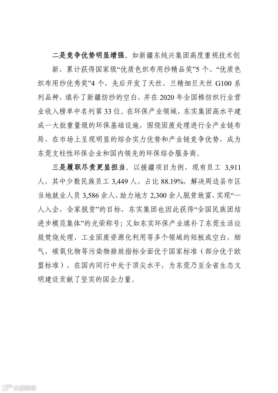 新疆100万锭纺织项目,作为东实集团的产业援疆项目,在筹建期即引入东莞本土资金实力雄厚的以纯集团,以弥补资本之缺,为项目落地提供了强大助力。项目投产后,引入全国棉纺龙头企业山东德州恒丰集团,借助其成熟的运营管理模式、深耕多年的行业经验以及销售渠道等优势,增强管理之效。为此,新疆东纯兴集团虽作为棉纺织行业的新军,但投产后在行业内迅速打响名气,在最新一期中国棉纺织行业协会的认证排名中名列第33位,2021年项目营收超25亿元,高标准、高质量地完成省、市交办的产业援疆任务。
