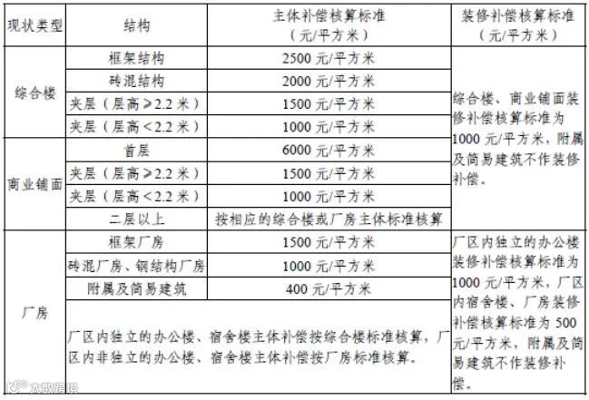 5、不符合物业置换的住宅房屋建筑面积,按照主体结构类型给予补偿,核算标准为框架结构3000元/平方米,砖混结构2500元/平方米,夹层(层高≥2.2米)1500元/平方米,夹层(层高<2.2米)1000元/平方米。建筑物主体结构类型不在上述核算标准范围内的,可委托具备资质的第三方评估机构进行评估,经评估督导后确定核算费用。