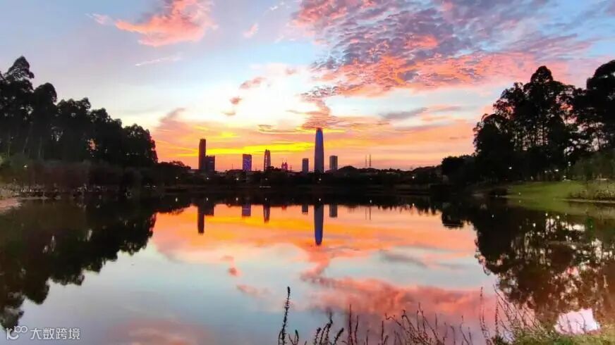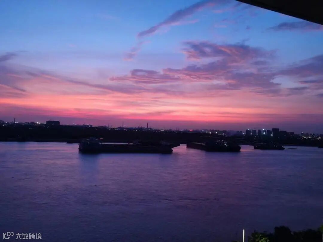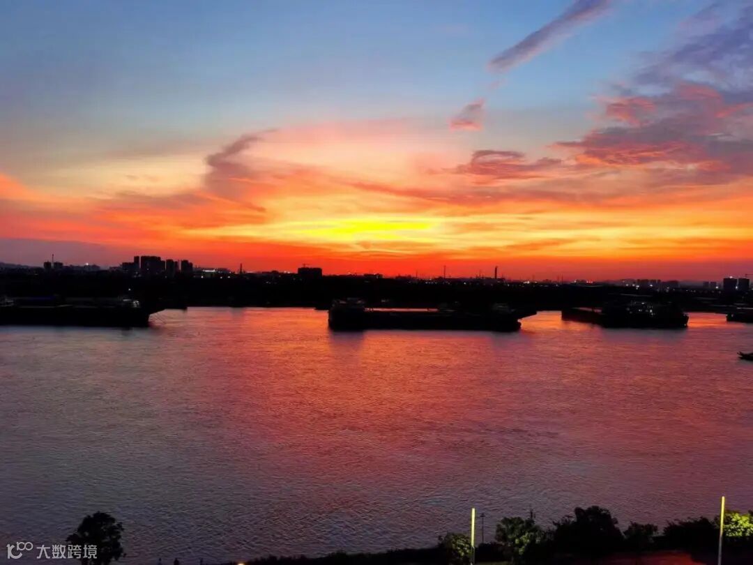金波衬着夕阳,漂亮的红晕之中,远处的“小蛮腰”隐约可见。