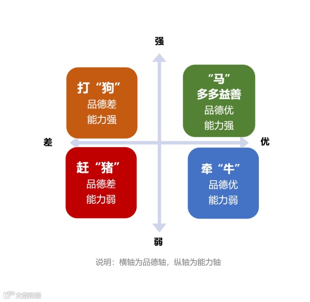 “‘牛’就是品德优,但能力稍弱的,我们是可以牵着走的;‘狗’就是能力虽强,但品德差,这是我们要“敲打”的,所以叫‘打狗’;‘猪’是什么呢?不但能力弱,品德又差的,我们就不欢迎,在职场上就会被淘汰,所以叫‘赶猪’。”