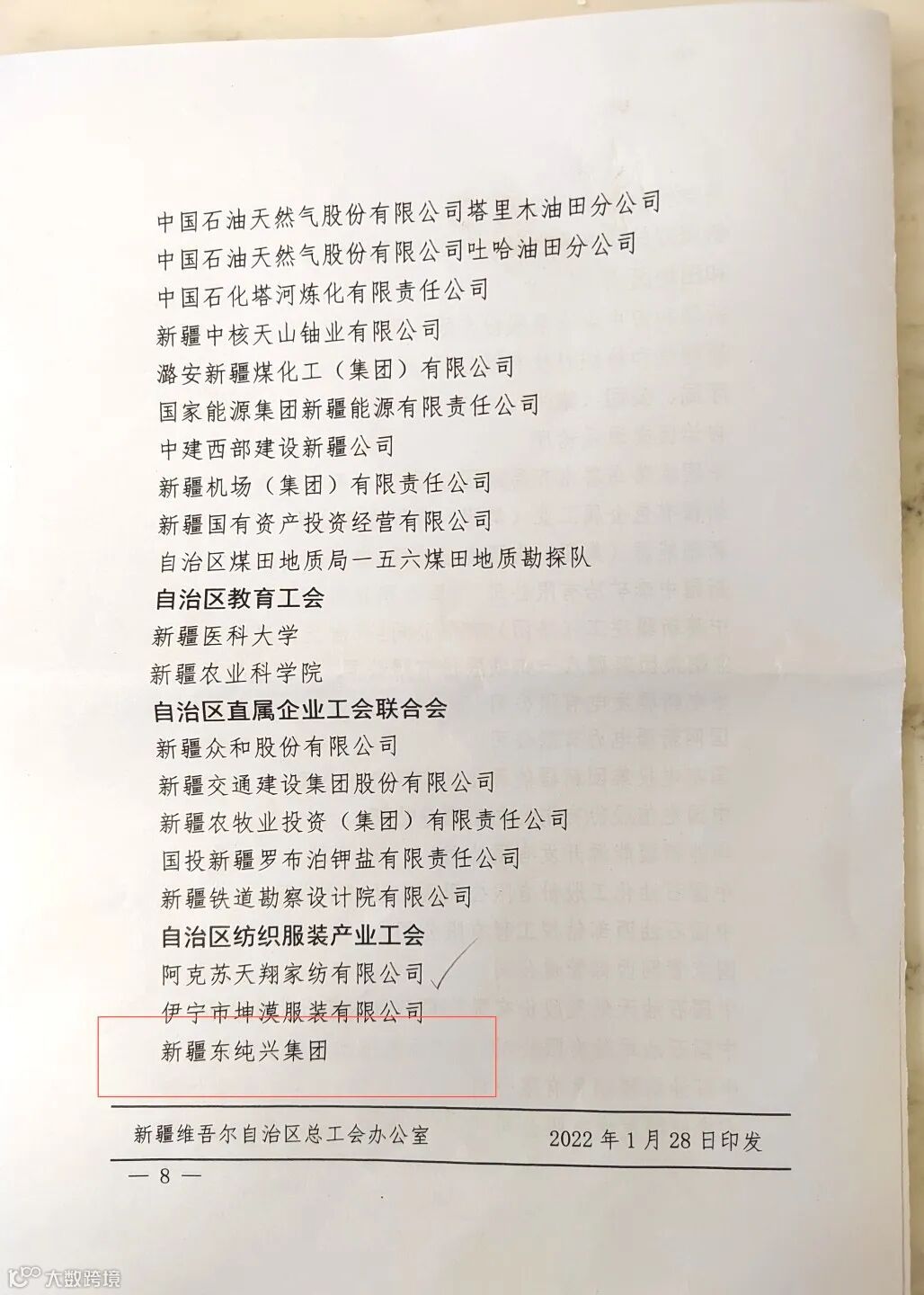 2022年,新疆东纯兴集团荣获由新疆维吾尔自治区总工会命名的“全区产业工人队伍建设改革‘最佳实践单位’称号”。