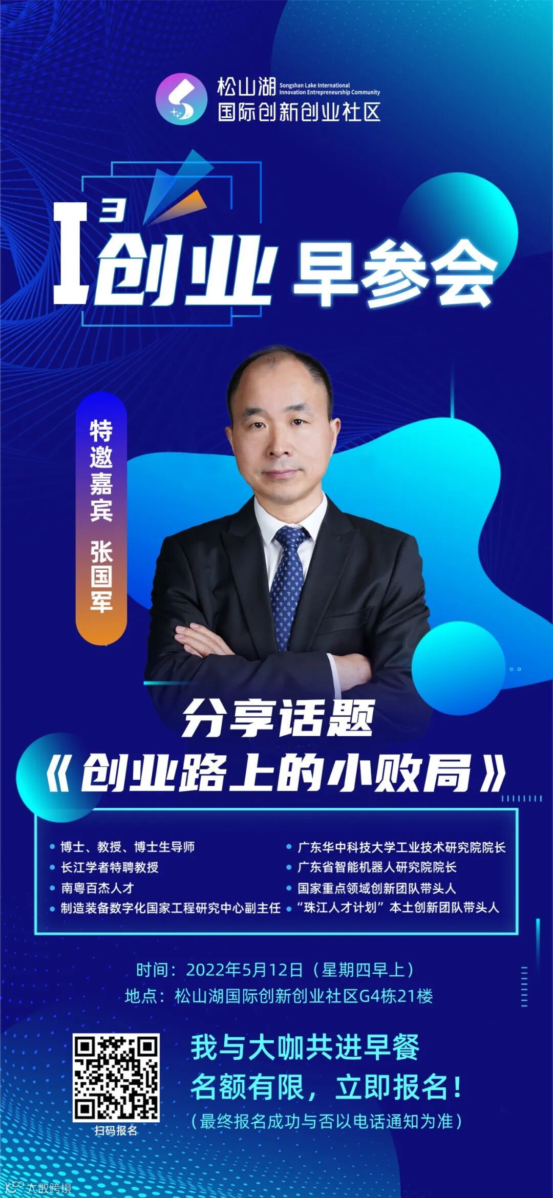 “I3创业 ・早参会”第一期,我们特别邀请到广东省智能机器人研究院院长张国军担任分享嘉宾,以《创业路上的小败局》为分享话题,和大家一起聊一聊创业路上曾经走过的、看过的、听过的那些“小败局”,让我们的创业路少一些弯路,少一些雷区,越走越顺畅。