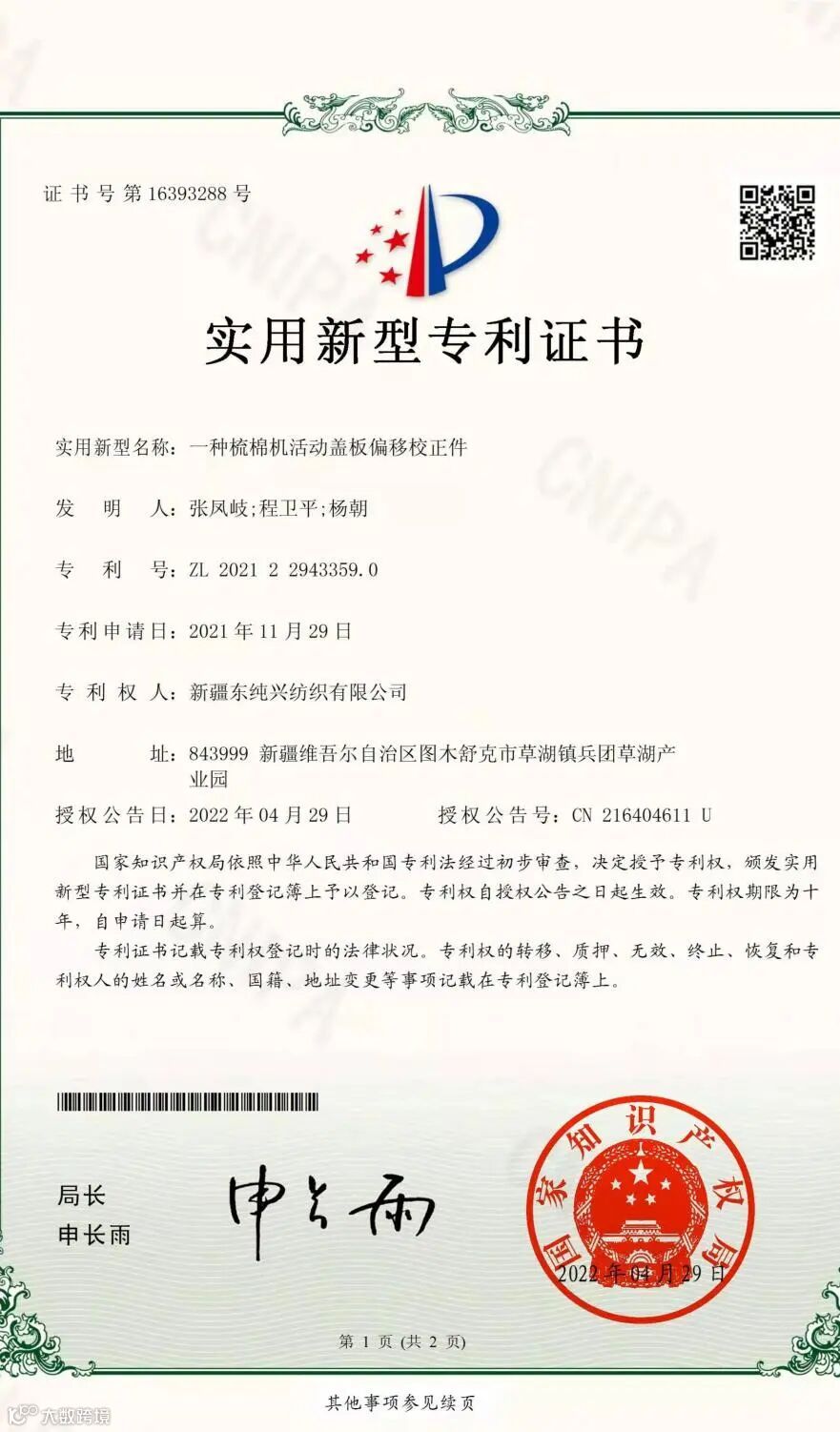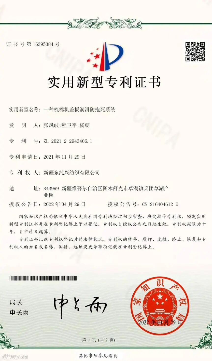 专利证书的取得,体现了东纯兴集团的自主研发能力和科技创新能力,同时也将激励东纯兴集团骨干技术人员再接再厉,持续开展科研创新工作,助力东纯兴集团打造成为新疆地区乃至全国纺织行业科学技术标杆企业。