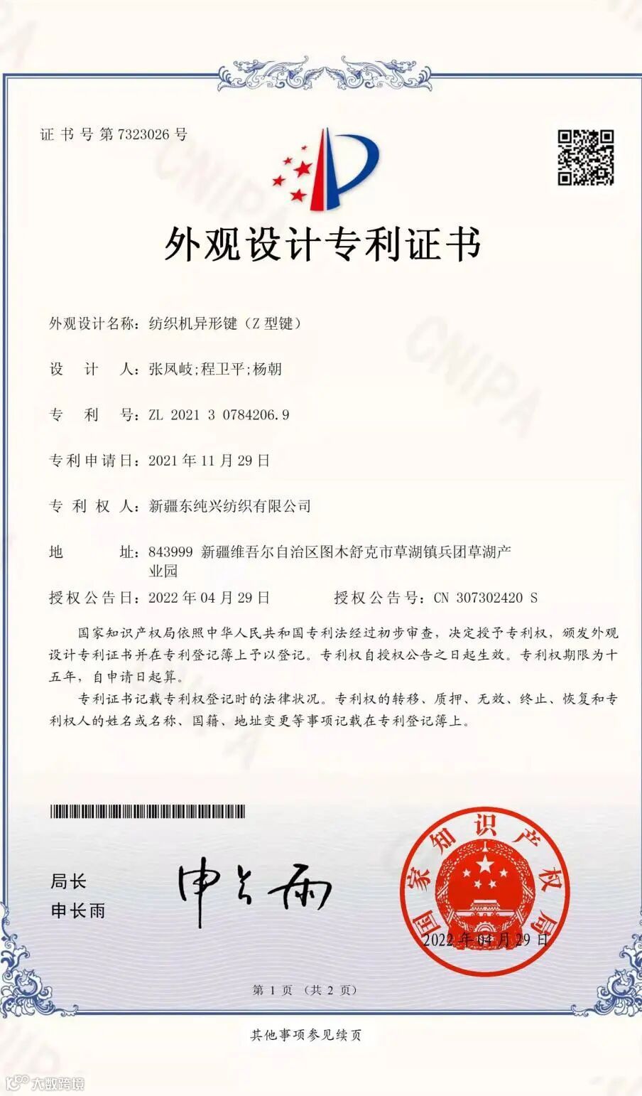 近日,东纯兴集团收到了由国家知识产权局核发的三项专利证书,包括1项外观设计专利——“纺织机异形键(Z形键)”,2项实用新型专利——“一种梳棉机活动盖板偏移校正件”、“一种梳棉机盖板润滑防抱死系统”。