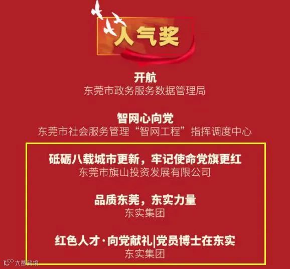 东实集团参赛的三个短视频作品——《砥砺八载城市更新,牢记使命党旗更红》、《品质东莞,东实力量》、《红色人才·向党献礼|党员博士在东实》均荣获该大赛的“人气奖”。在活动现场,东实集团作为获奖单位代表上台领奖。