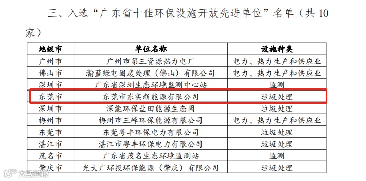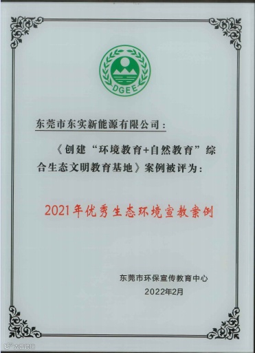 2022年3月,生态环境部开展“2022年十佳环保设施开放单位”宣传推选活动。经广东省初选,东实新能源公司荣获“广东省十佳环保设施开放先进单位”,同时作为东莞市唯一一家单位,参加2022年国家级“十佳环保设施开放单位”宣传推选活动。