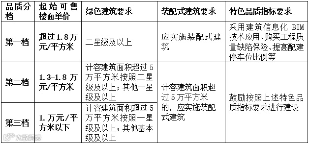 同时,《通知》根据公开出让住宅用地起始可售楼面单价对目前全市新建商品住宅项目进行了档次分类。针对不同档次的新建商品住宅项目,分别在绿色建筑要求、装配式建筑要求及特色品质指标要求上提出了不同的规定。