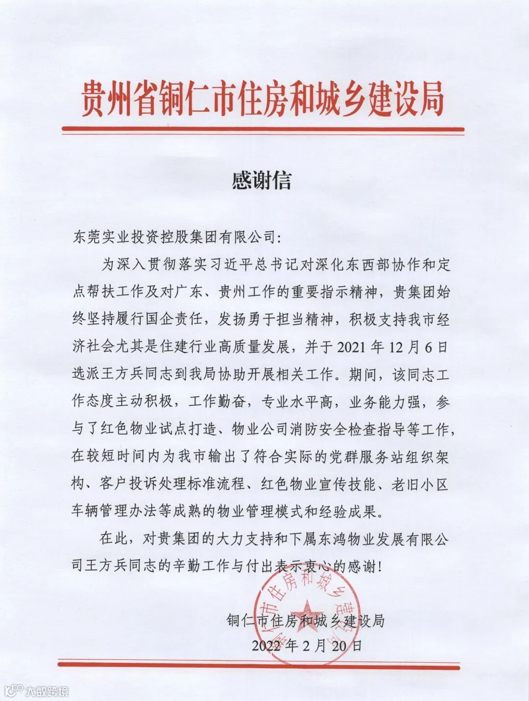 近日,东实集团收到一份来自贵州省铜仁市住房和城乡建设局的感谢信。信中对东实集团积极支持铜仁市经济社会高质量发展表示由衷的感谢,对广东东鸿物业发展有限公司(下文简称“东鸿公司”)王方兵同志在协助当地物业管理工作方面的贡献给予了充分肯定。