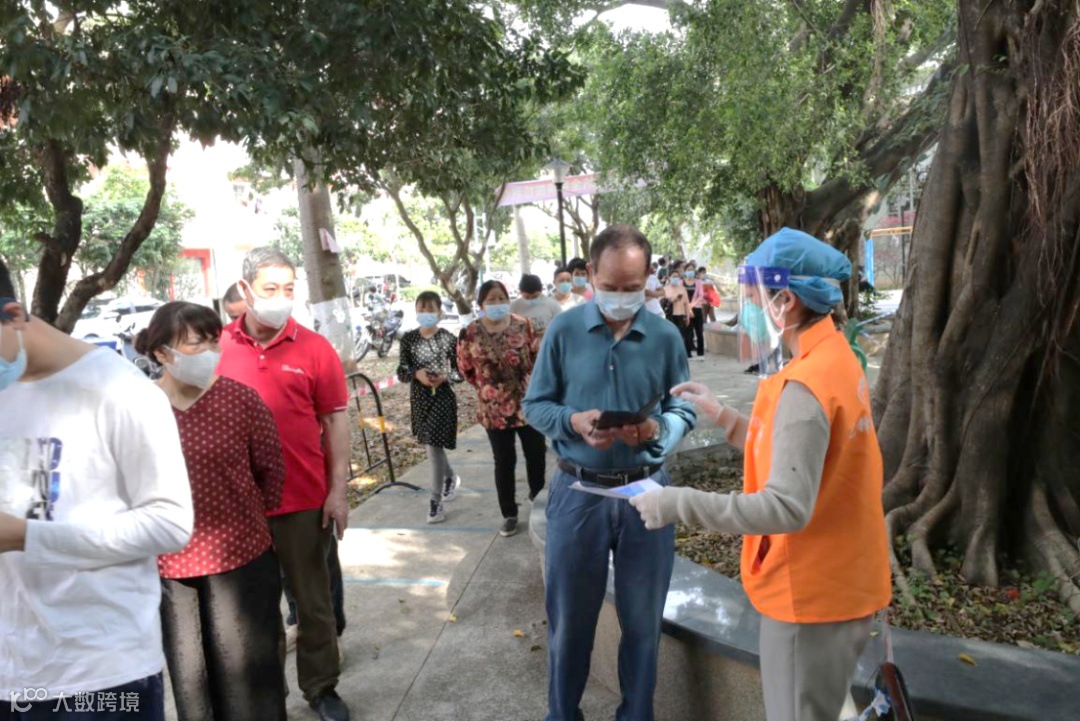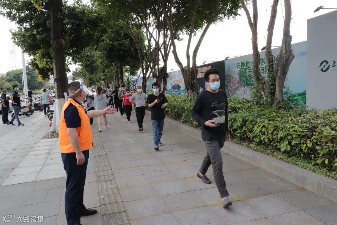 “您好,请间隔一米排队,提前出示核酸检测粤核酸码,谢谢配合!” “您好,排队请注意旁边的防护线,注意脚下的路,以防摔倒!” 这批身着橙色马甲的志愿者高举提示牌,礼貌地提醒着核酸检测点的市民们戴好口罩、有序排队、提前出示粤核酸码。