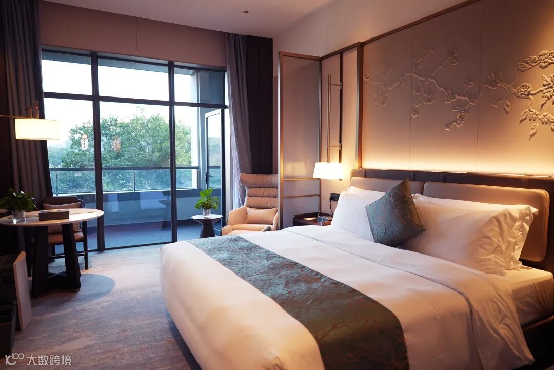 不一样的客房。走进东莞迎宾馆北区的湖景房,一进房间,映入眼帘的是映月湖的湖景,依山傍水、怡然自得。房间内配备了智能马桶等智慧家居。房间分区精致,还配备了小型会晤室。据介绍,东莞迎宾馆北区设多种房型共 374 间客房,房间面积 39-326 m²,配备智能灯光控制系统、智慧屏系列产品等前沿居室科技,国际著名品牌卫浴、寝具等生活设施,专注提升客户居住体验。
