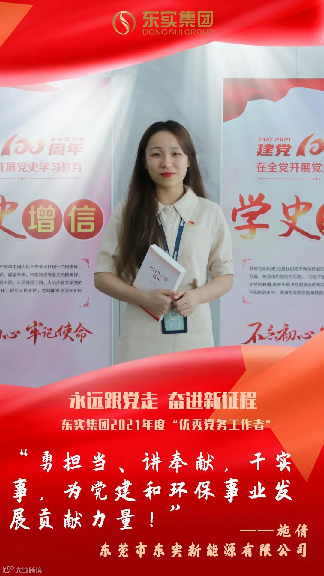为庆祝中国共产党成立100周年,认真配合中央、省和市开展评选表彰活动,根据市国资委《关于在市属国有企业中做好先进典型选树宣传工作的通知》要求,东实集团党委结合实际,选树了30个个人典型和3个集体典型。