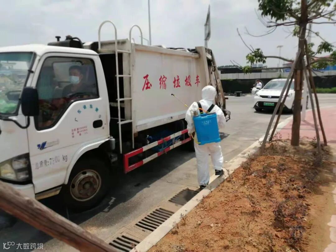 (工作人员正按照冻肉处置流程对麻涌疫情垃圾运输车进行消杀)