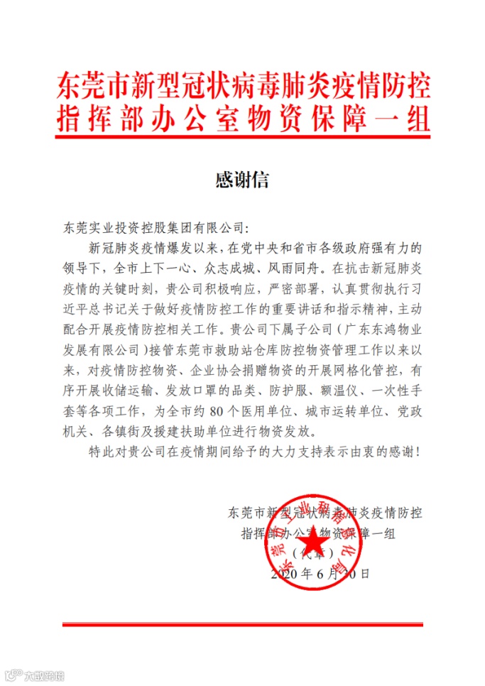 6月30日,东实集团收到一封来自东莞市新型冠状病毒肺炎疫情防控指挥部的感谢信: