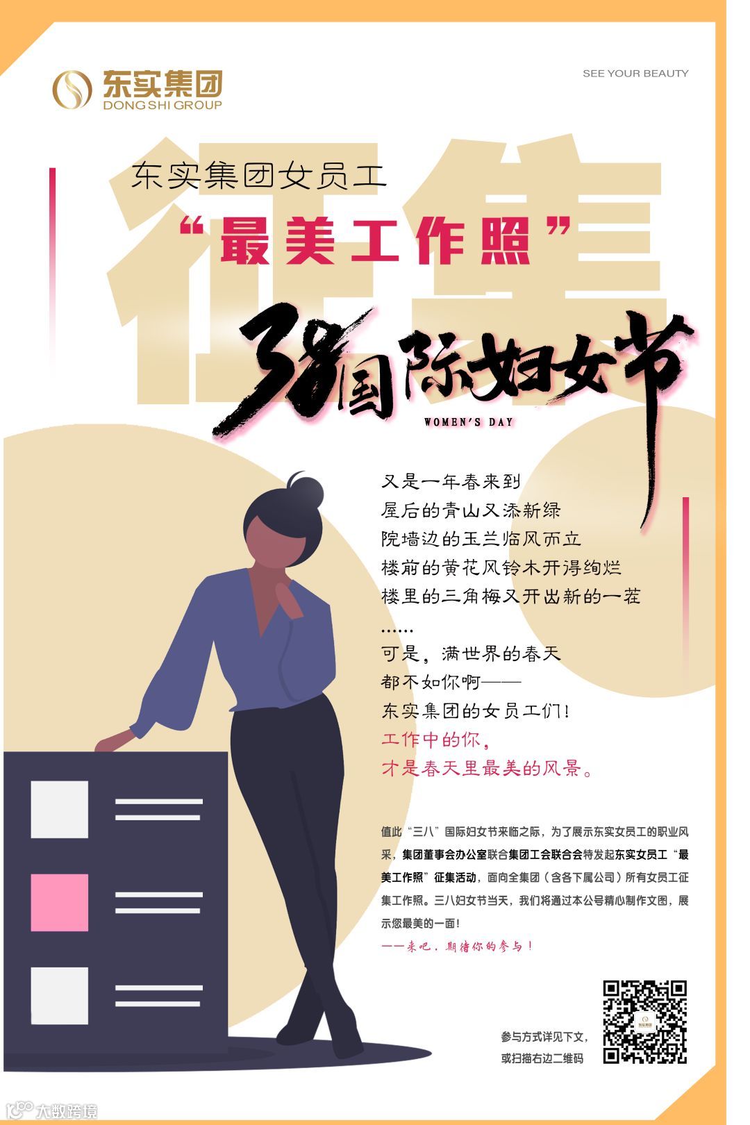 为展示东实女员工的职业风采,值此“三八”国际劳动妇女节来临之际,集团董事会办公室联合集团工会联合会特发起东实女员工“最美工作照”征集活动,即日起至3月6日下午(周五)18:00,面向全集团(含各下属公司)所有女员工征集工作照。妇女节当天,我们将通过本公号精心制作文图,展示您最美的一面!