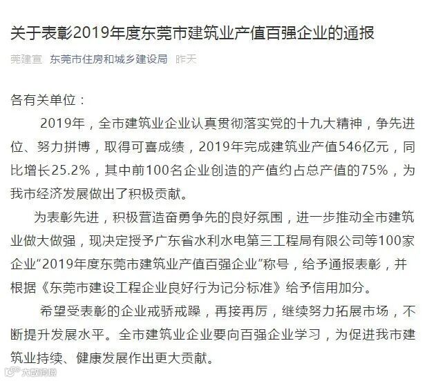 3月9日下午,东莞市住房和城乡建设局通报表彰了2019年度东莞市建筑业产值百强企业名单。其中,东实集团全资子公司——东莞市莞城建筑工程有限公司荣列市建筑业产值第11名,荣获“2019年度东莞市建筑业产值百强企业”称号,并根据《东莞市建设工程企业良好行为记分标准》给予信用加分。