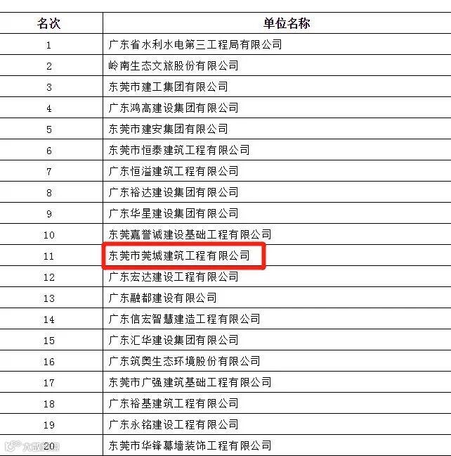 2019年东莞市建筑业总产值前20名企业名单