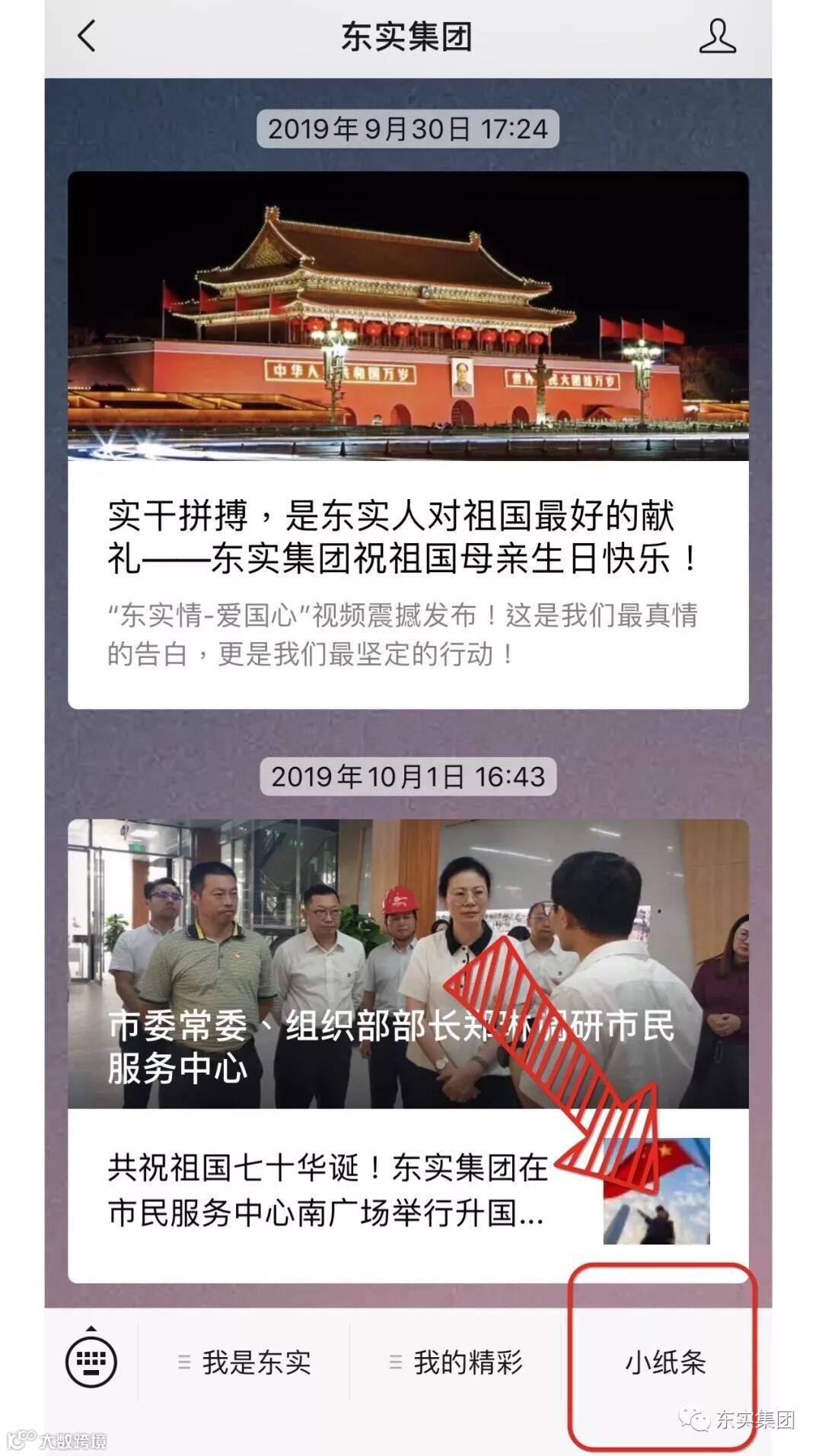 1. 打开“东实集团”微信公众号首页,点击右下角“小纸条”。